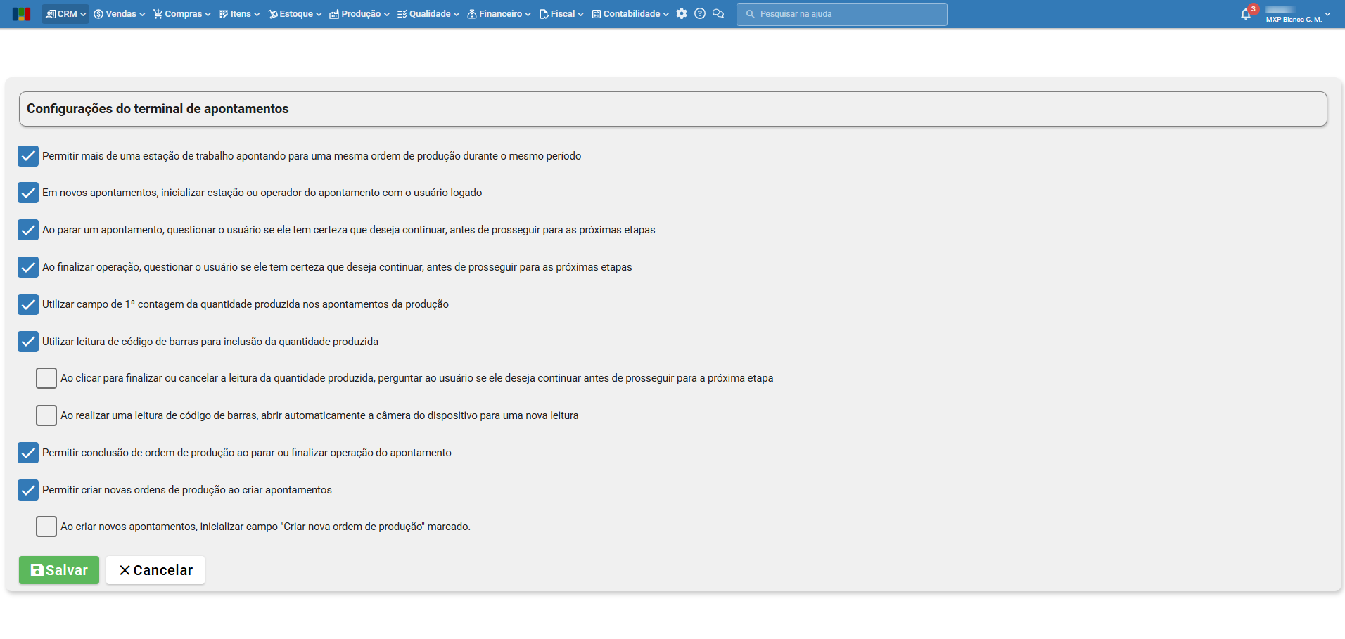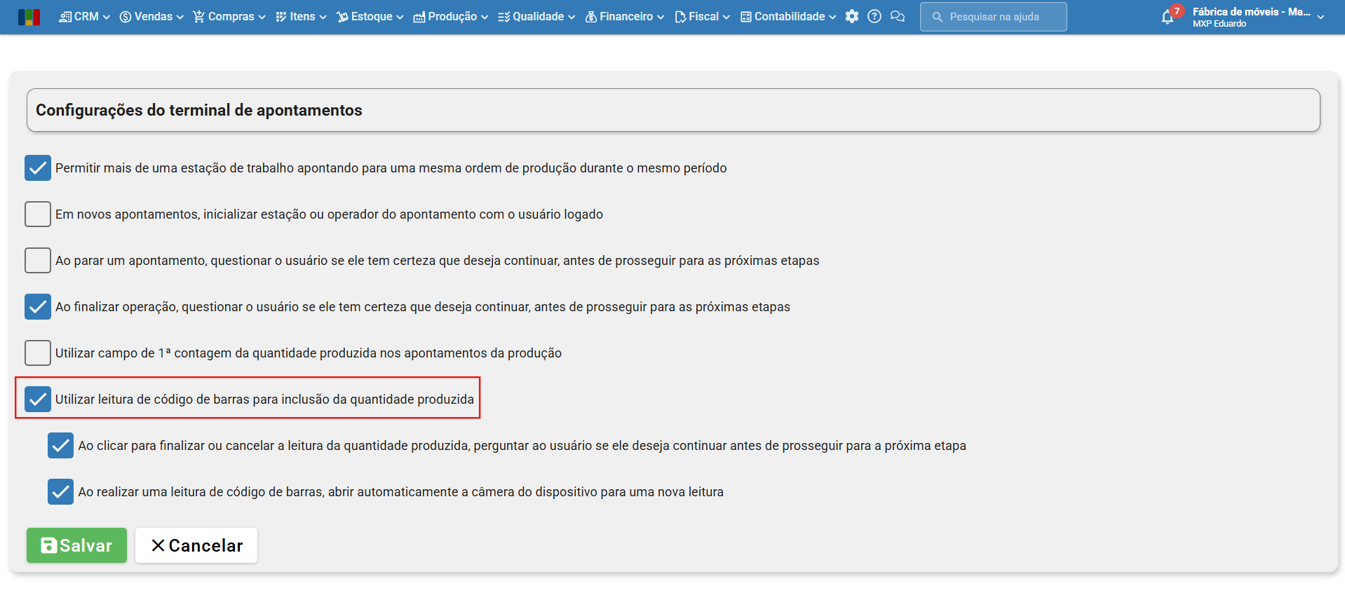 2) Marque a caixa de seleção da configuração “Utilizar leitura de código de barras para inclusão da quantidade produzida” para habilitá-la. Clique no botão verde “Salvar” para guardar as alterações.
