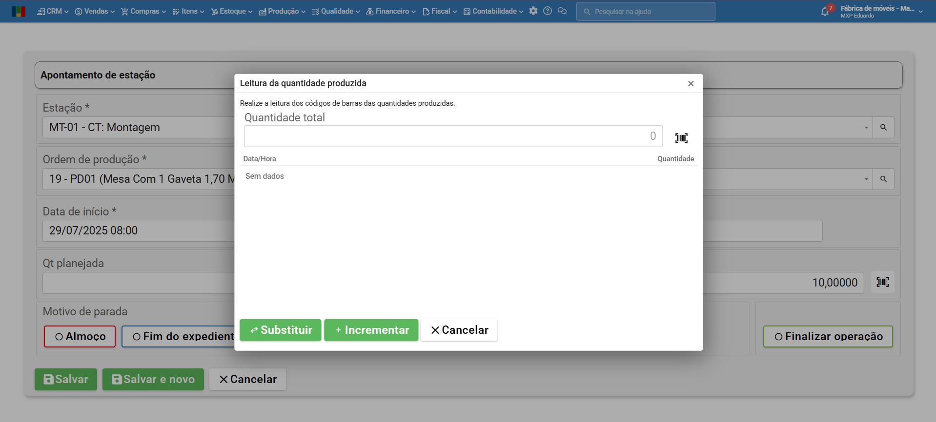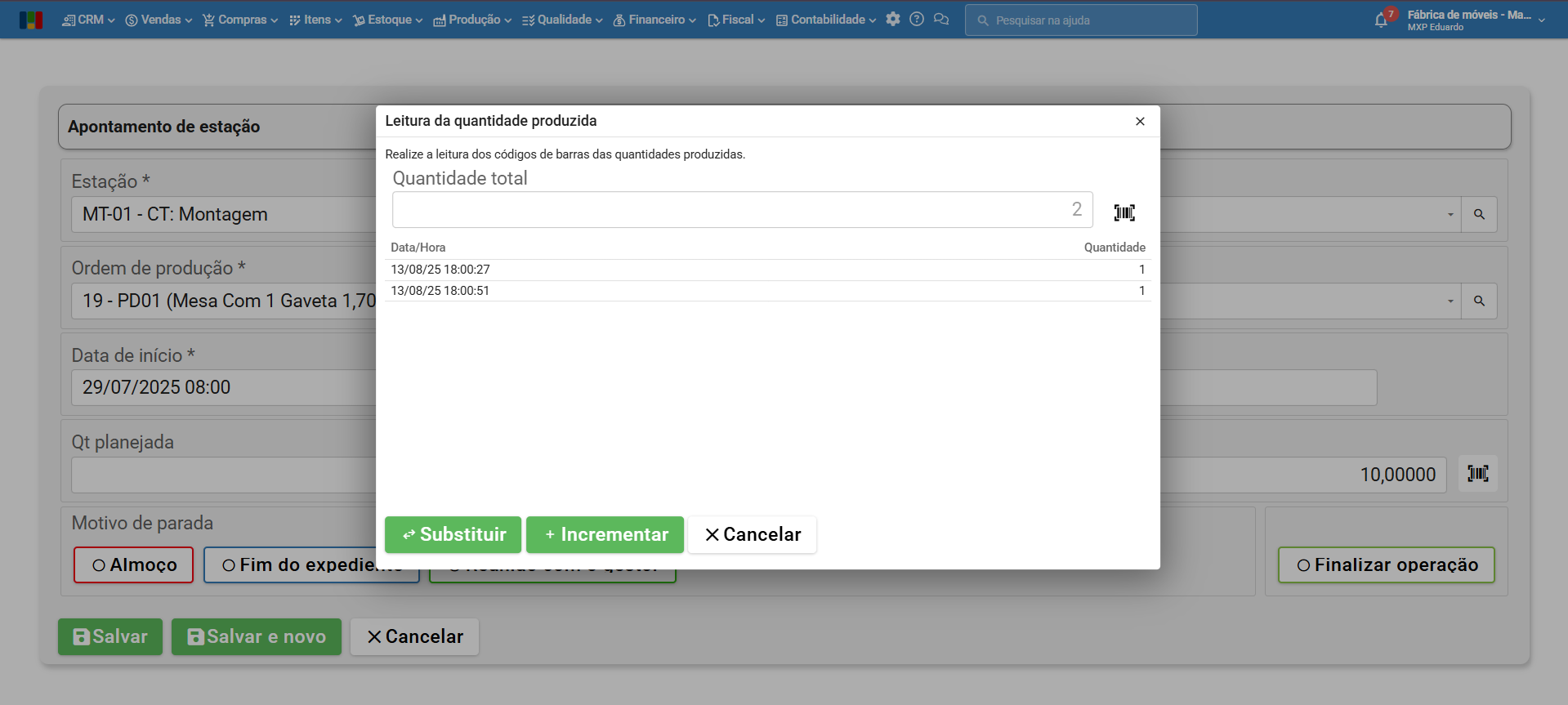 a) Para substituir o valor do campo “Qt produzida” (ou “Qt produzida na 1ª contagem”) com o total lido em “Quantidade total”, clique no botão verde “Substituir”.