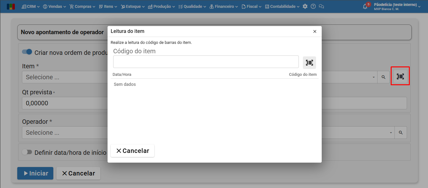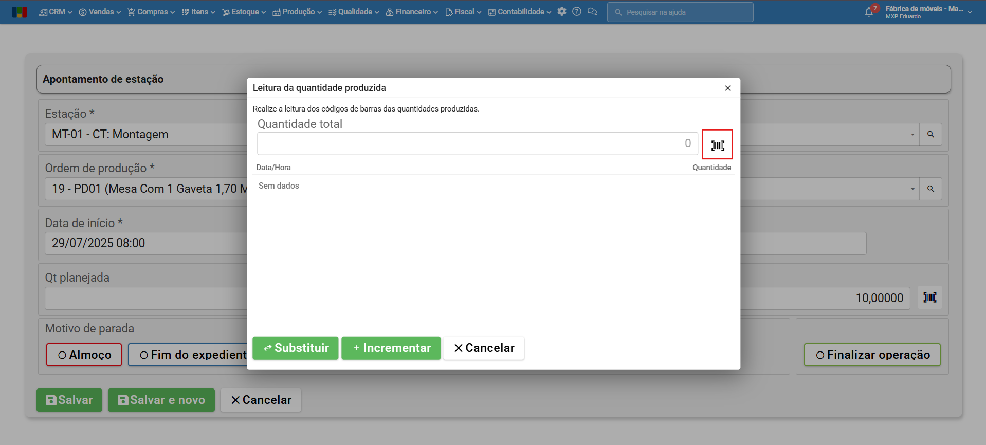 3) Ao abrir um apontamento, é possível ver que o sistema incluiu ao lado dos campos “Qt produzida na 1ª contagem” e “Qt produzida” um botão para leitura do código de barras. Clique nele para abrir o modal de leitura.