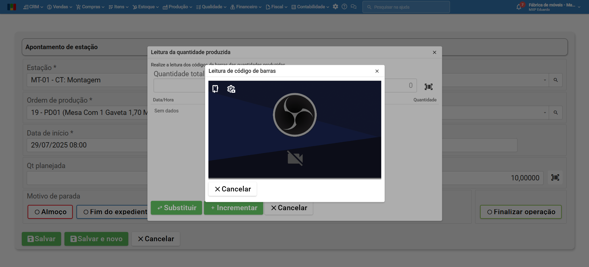 Uma vez que a configuração Utilizar leitura de código de barras para inclusão da quantidade produzida” esteja marcada, é possível inserir valores de quantidade produzida a partir da leitura de códigos de barras através da câmera do dispositivo.