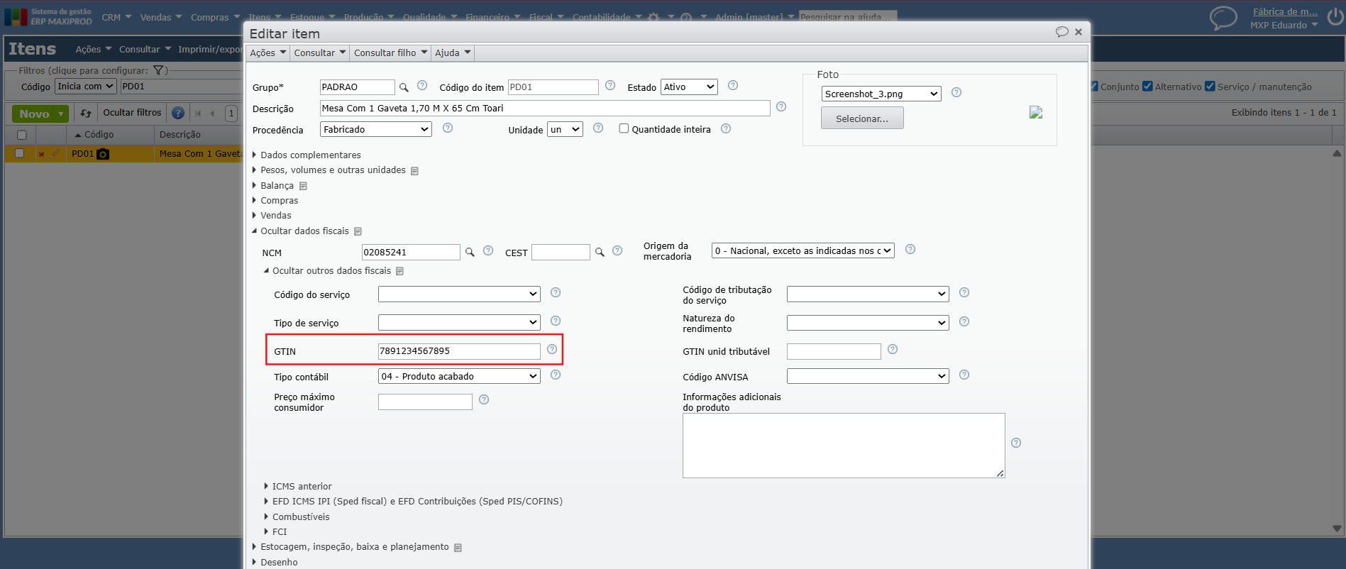 a) GTIN do item da ordem de produção: o sistema irá verificar se o número do código de barras corresponde ao GTIN informado no cadastro do item. Para consultar ou alterar o GTIN, acesse a tela “Itens > Itens” e, na edição do item, abra a seção “Dados fiscais > Outros dados fiscais > GTIN”. Cada leitura bem sucedida de um código de barras com este formato somará a quantidade “1”.