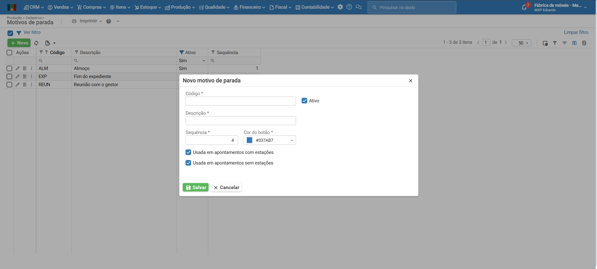 5) Após cadastrar o motivo de parada, é possível utilizá-lo nos apontamentos.