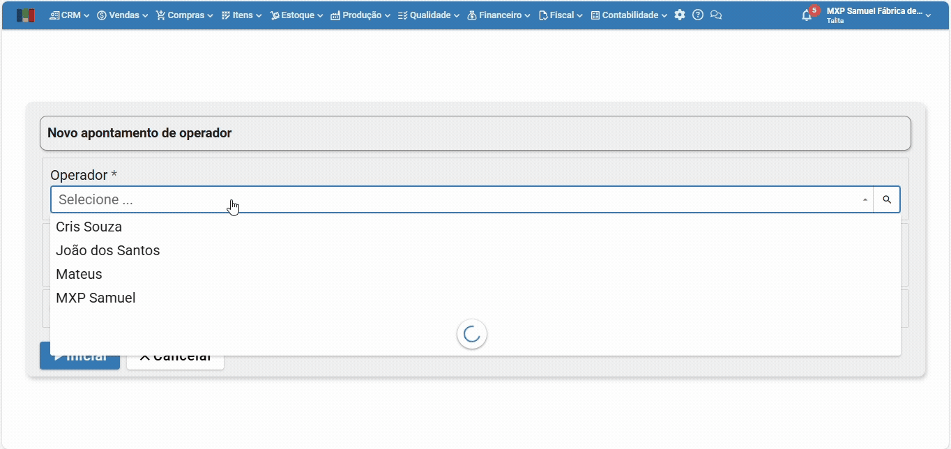 • Operador: campo obrigatório, lista as opções cadastradas em “Produção > Pessoas” que tem a configuração “Pode ter apontamento” marcada. Para saber mais, clique no menu superior “Produção > Pessoas”.