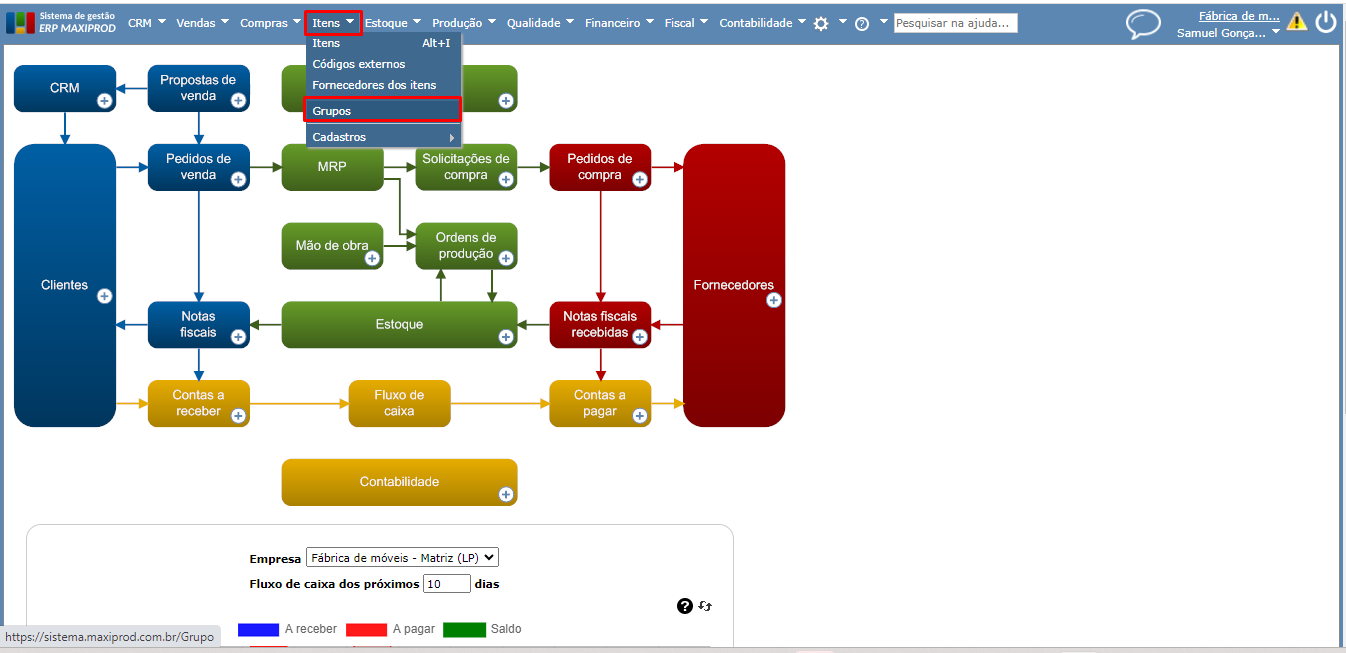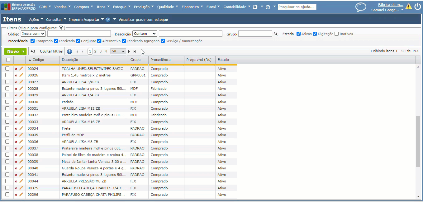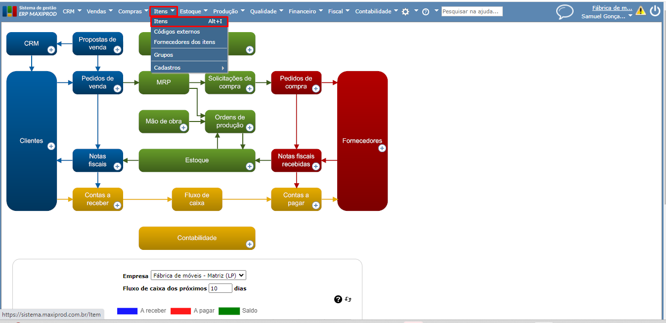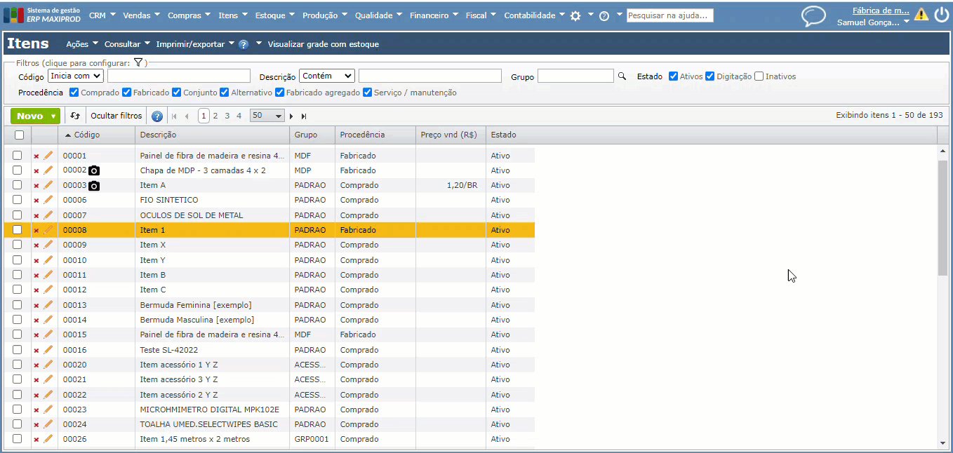1) Acesse a tela de itens, através do menu superior “Itens > Itens”.