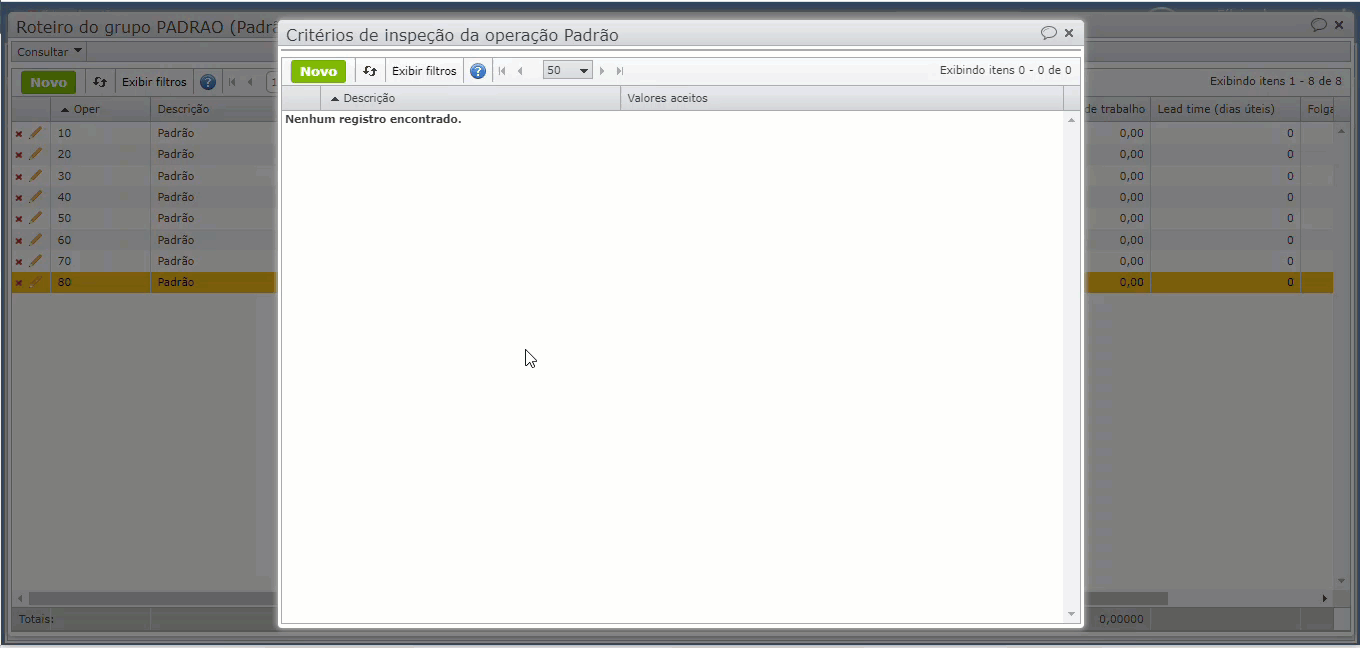 - por sua vez, os critérios associados a uma operação do roteiro de um item são inicializados pelos critérios de inspeção da respectiva operação do roteiro do grupo de itens, podendo ser editados, operação a operação.