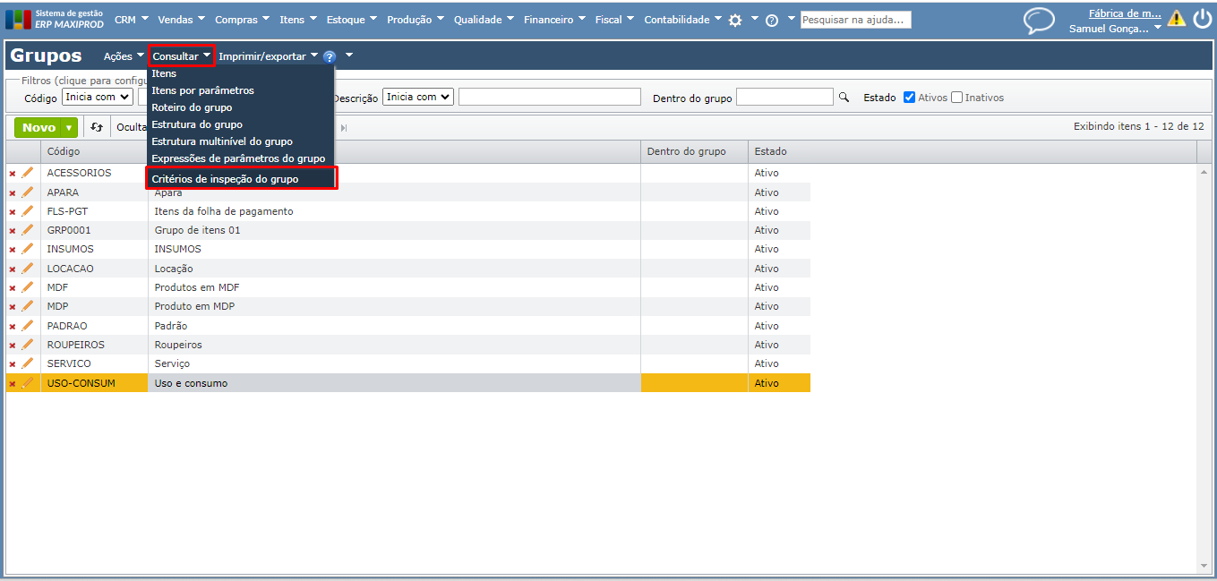 2) Na tela de grupos de itens, selecione o grupo no qual deseja inserir os critérios de inspeção, deixando a linha amarelada, e acesse o menu “Consultar > Critérios de inspeção do grupo”.