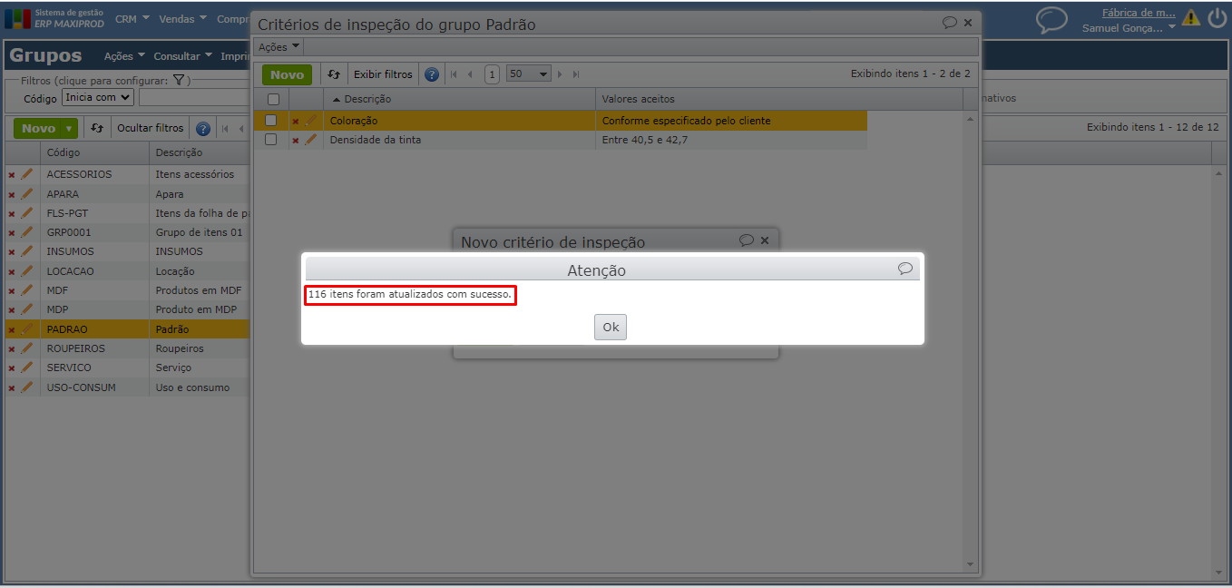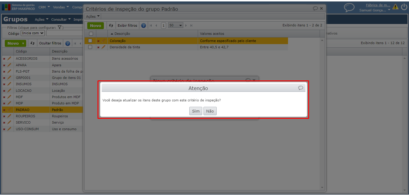 5) Ao clicar em “Sim”, o sistema atualiza os critérios de inspeção dos itens do grupo, incluindo o novo critério.