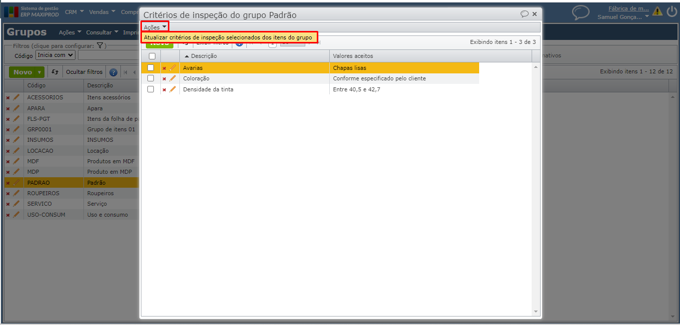 6) Mesmo o usuário optando por não atualizar os itens do grupo com o critério cadastrado, posteriormente é possível atualizar os critérios de inspeção dos itens já cadastrados, bastando marcar a caixa de seleção do critério e acessar o menu “Ações > Atualizar critérios de inspeção selecionados dos itens do grupo”.