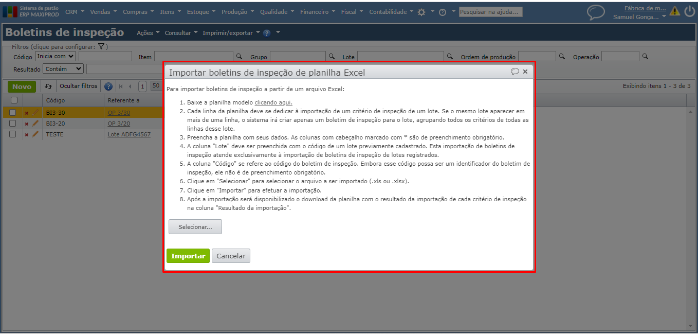 O vídeo abaixo mostra como criar boletins de inspeção no ERP MAXIPROD: