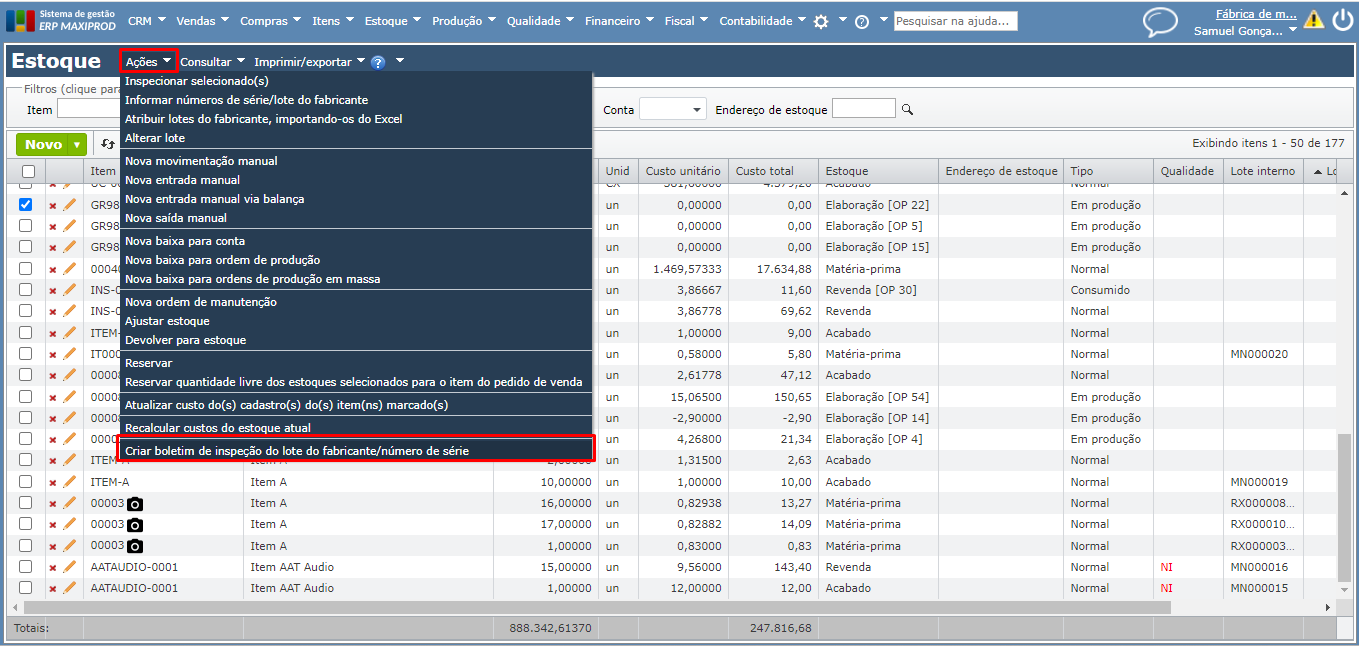 - Menu superior “Estoque > Estoque”: selecione a linha do item e utilize o submenu “Ações > Criar boletim de inspeção do lote do fabricante/número de série”.