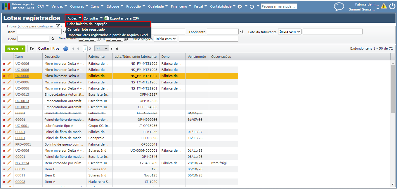- Menu superior “Compras > Itens das notas fiscais recebidas”: selecione a linha do item e utilize o submenu “Ações > Criar boletim de inspeção do lote do fabricante/número de série”.