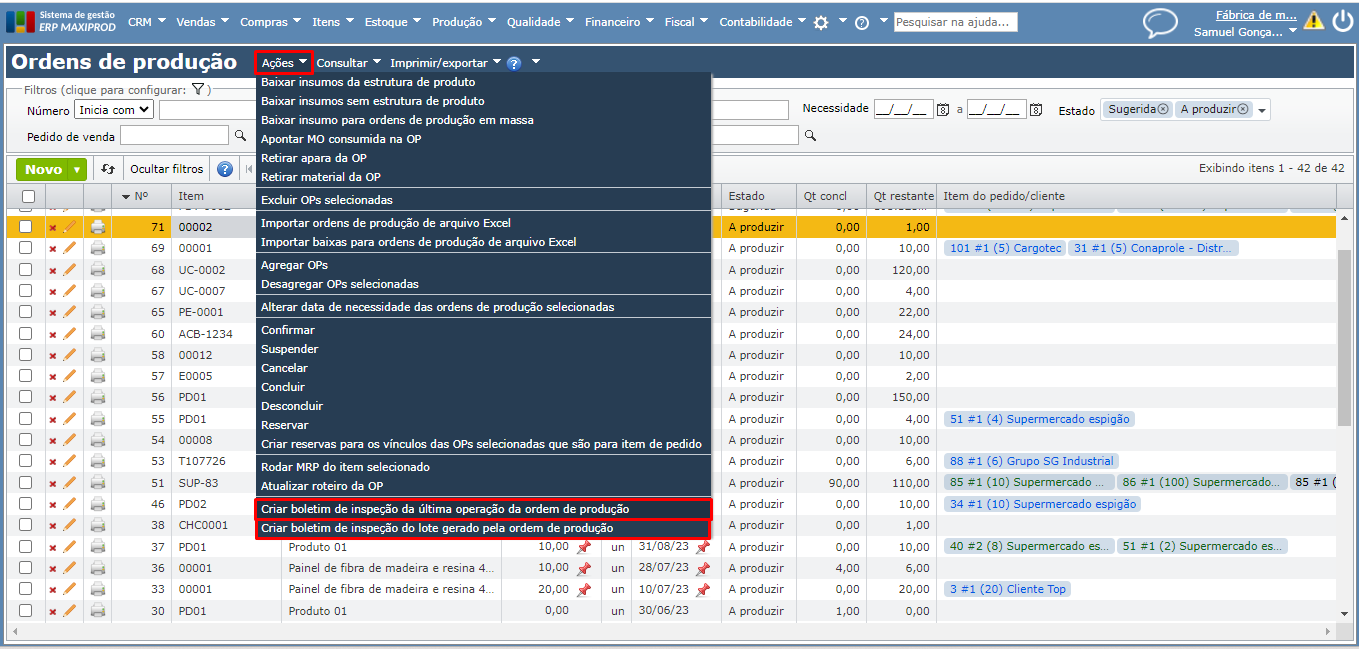 - Menu superior “Produção > Ordens de produção”: selecione a OP e acesse o submenu “Ações > Criar boletim de inspeção da última operação da ordem de produção” ou “Criar boletim de inspeção do lote gerado pela ordem de produção”.