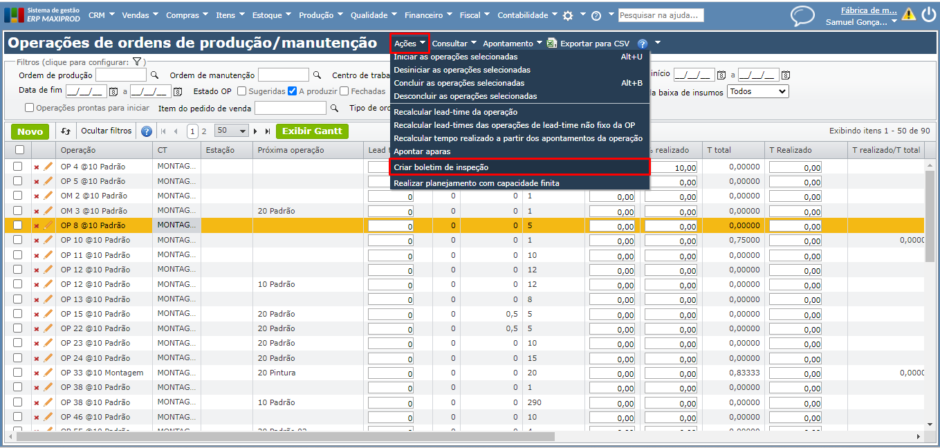 - Menu superior “Produção > Operações de ordens de produção e manutenção”: selecione a operação e acesse “Ações > Criar boletim de inspeção”.