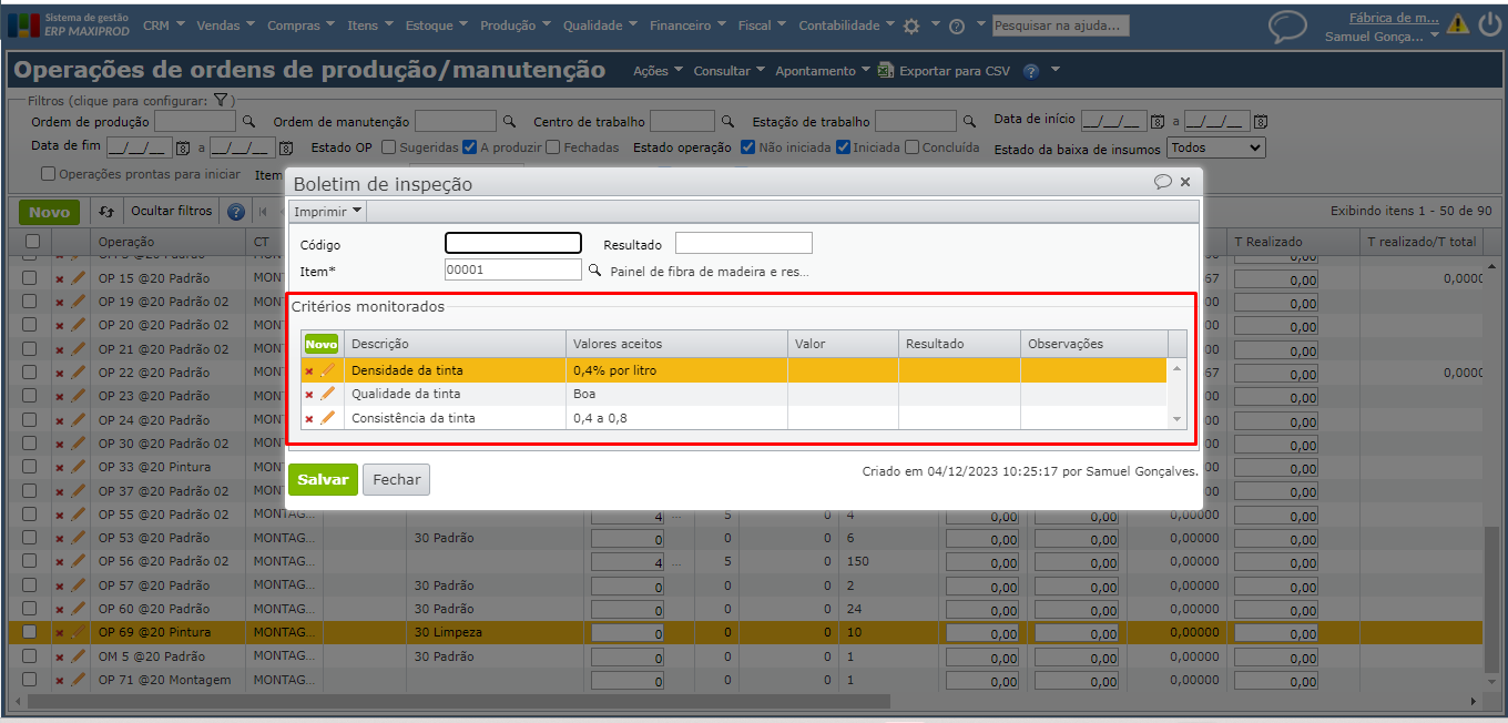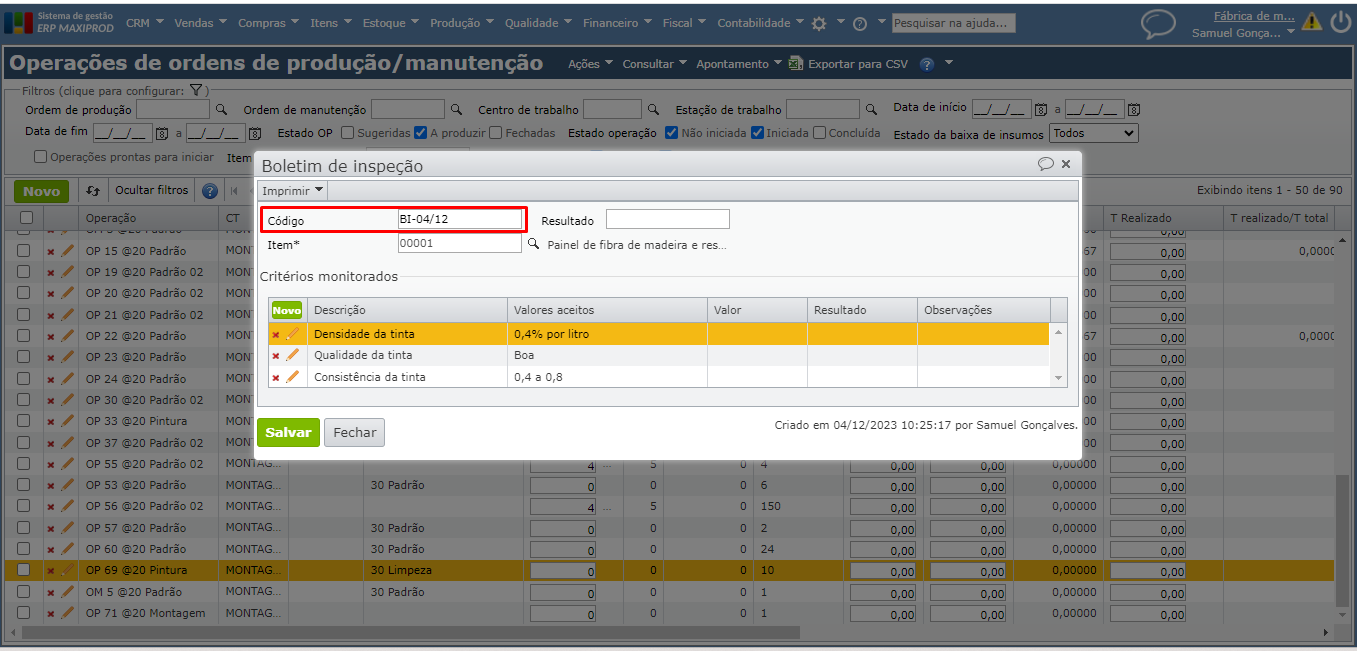 2) Ao clicar para criar o boletim de inspeção, se o item já tem critérios de inspeção cadastrados, estes são incluídos automaticamente no boletim de inspeção.