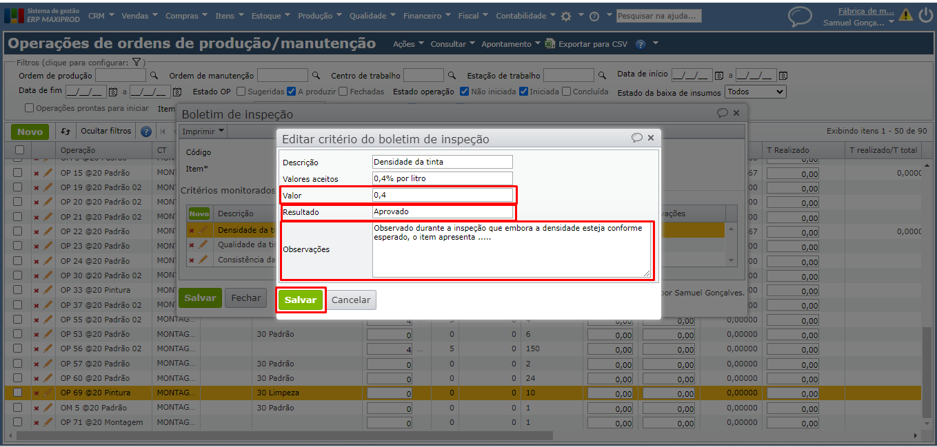4) Acesse a tela de edição dos critérios para informar os valores das análises, os resultados e observações. Clique no botão verde “Salvar”.