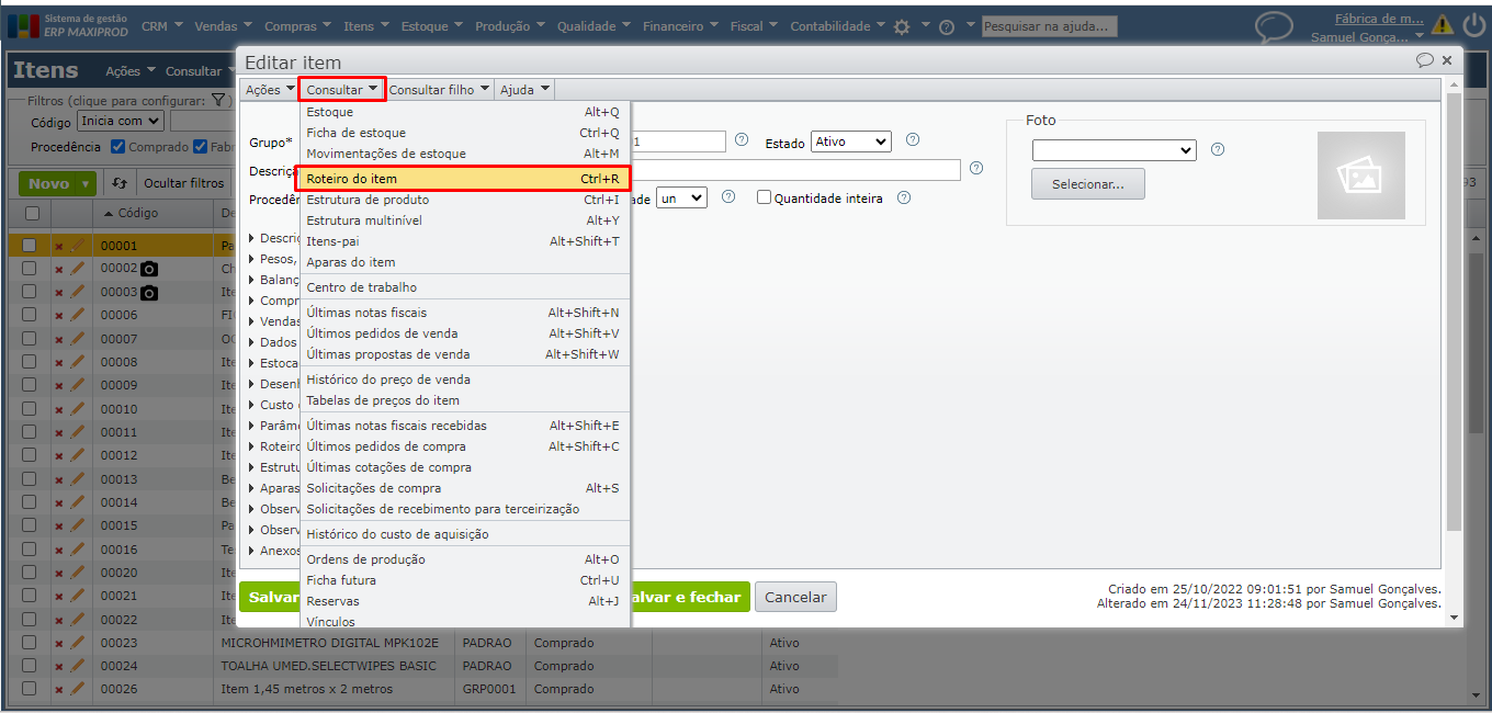 1) Na tela de itens, clique para editar o item e acesse o menu “Consultar > Roteiro do item”.