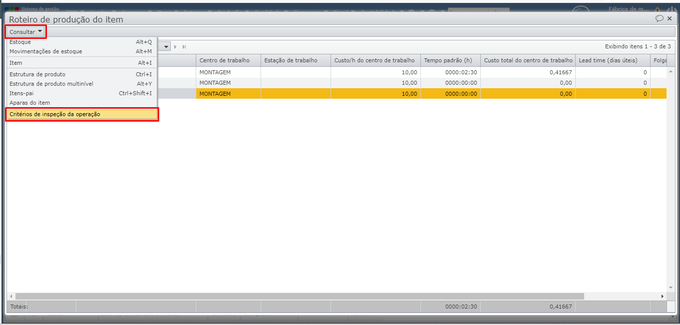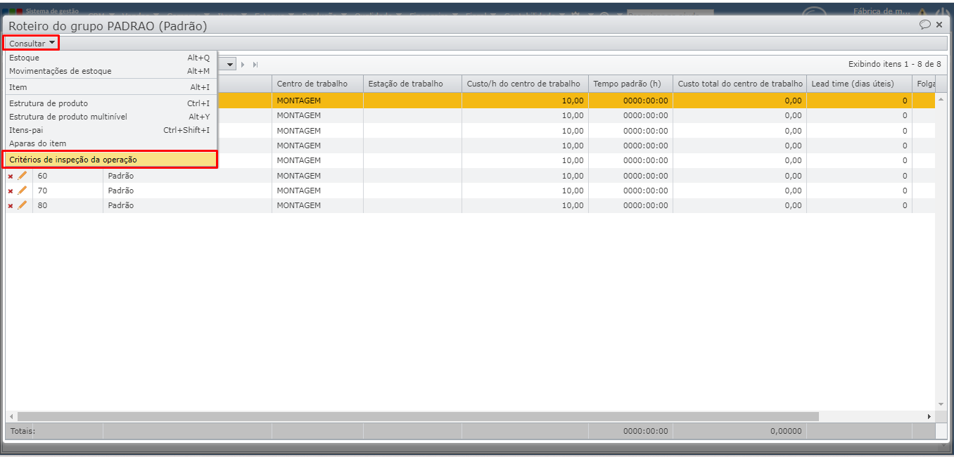 2) Na tela de roteiro do item, selecione a operação na qual deseja inserir os critérios. Acesse o menu “Consultar > Critérios de inspeção da operação”.