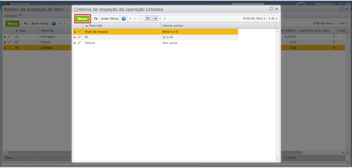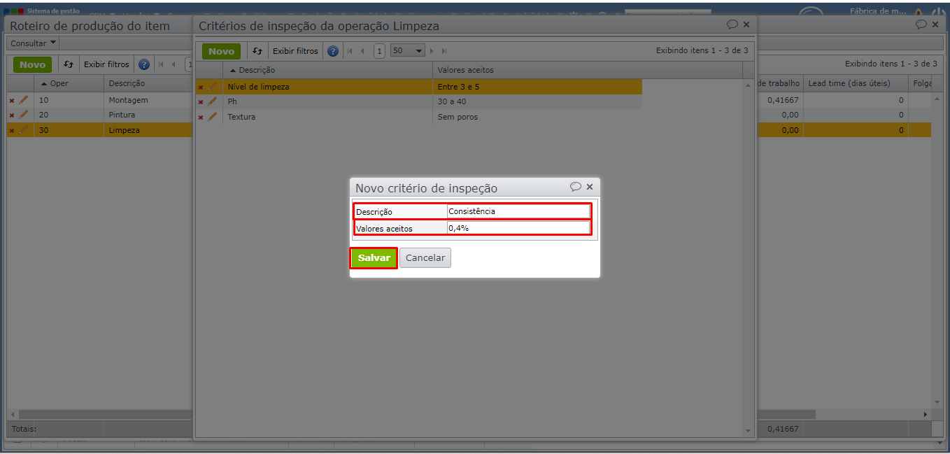 3) Na janela de critérios de inspeção, clique em “Novo”, e informe a descrição e os valores aceitos para o critério. Ao final, clique em “Salvar” para criar o novo critério.