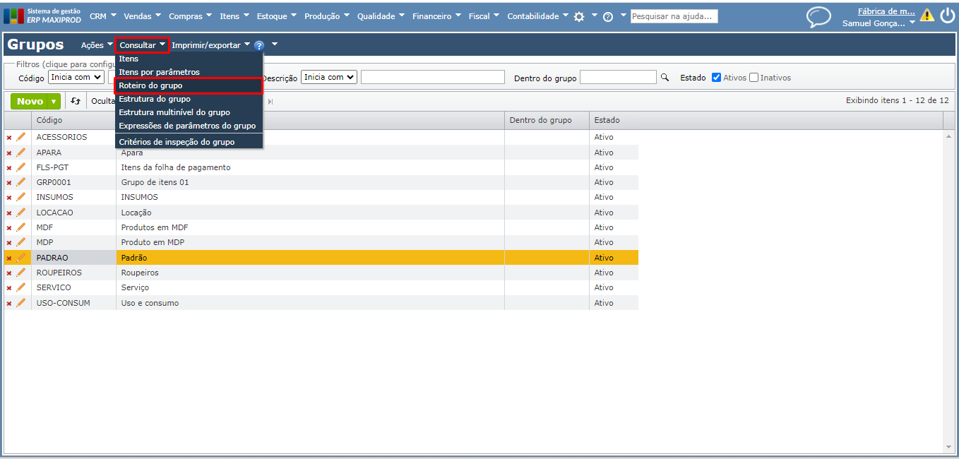 b) Selecione o grupo e acesse “Consultar > Roteiro do grupo”.
