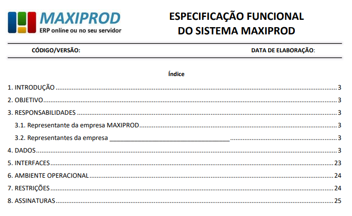 Veja abaixo uma captura de tela do sumário deste documento, se a sua empresa precisar do manual de especificação funcional do sistema, entre em contato com o suporte.