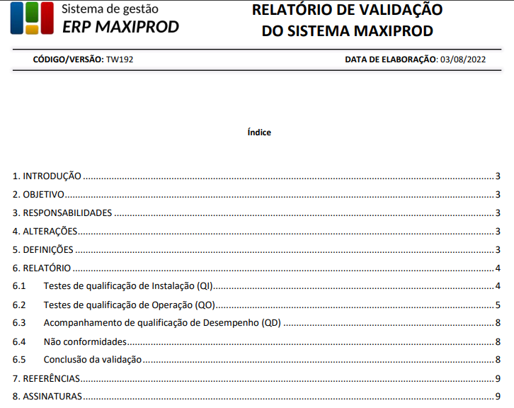 O objetivo deste documento é apresentar os resultados obtidos na validação do sistema ERP INDUSTRIAL MAXIPROD. Veja abaixo uma captura de tela do sumário deste documento. Se a sua empresa precisar do relatório de validação do sistema, entre em contato com o suporte.