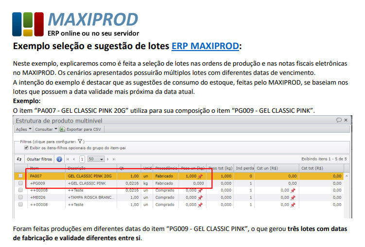 Este documento explica como é feita a seleção de lotes nas ordens de produção e nas notas fiscais. Se sua empresa precisa do manual de seleção e sugestão de lotes no sistema, entre em contato com o suporte.