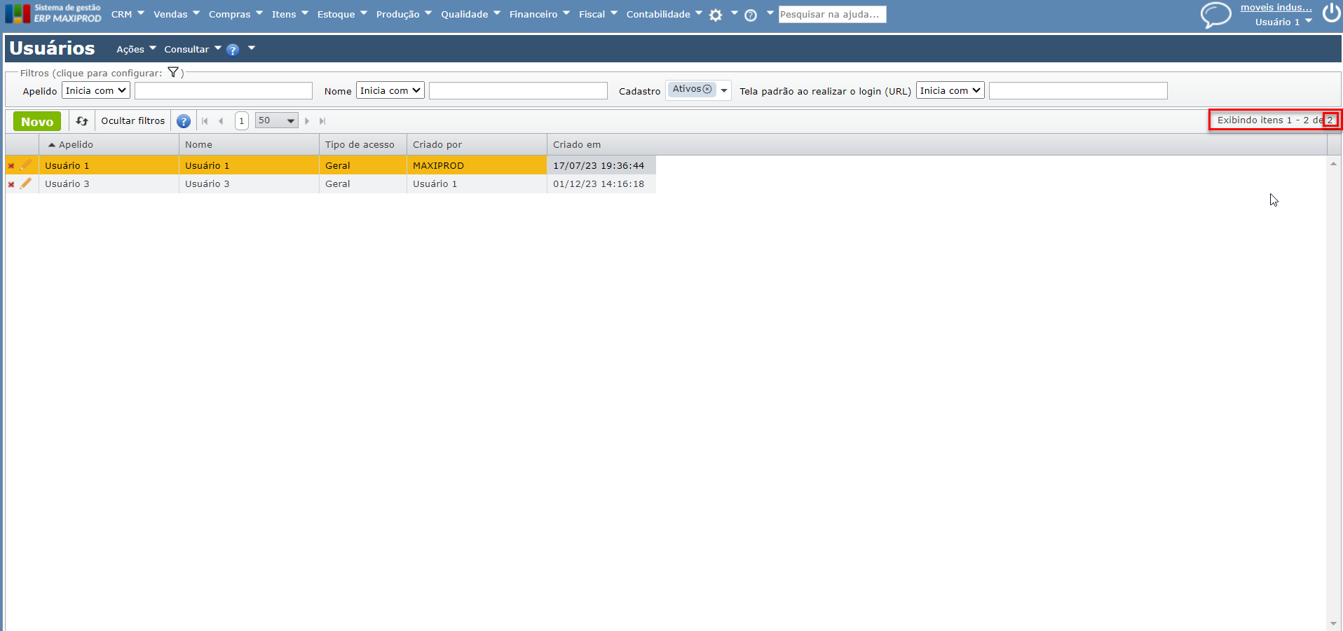 3) São exibidos todos os usuários cadastrados e ativos. A quantidade total de registros na grade pode ser visualizada na descrição “Exibindo itens * – * de *“, sendo que o último número dessa descrição representa o total de registros (usuários cadastrados).