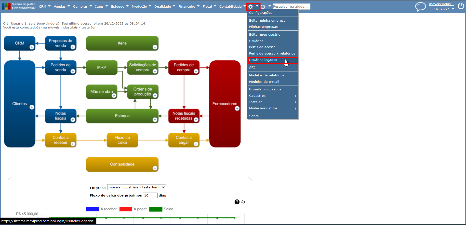 1) Acesse o menu “Roda dentada > Usuários logados”.
