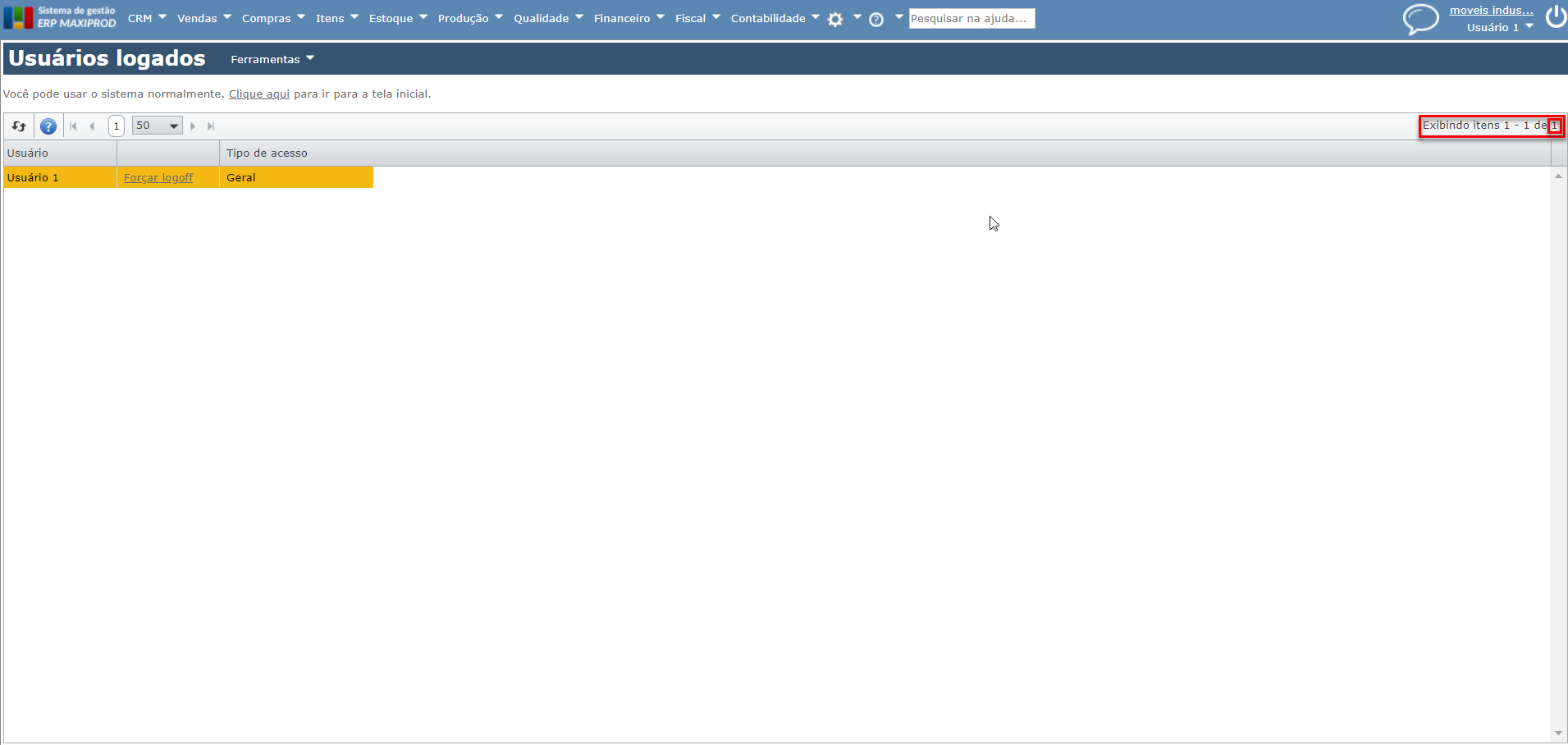 2) São exibidos todos os usuários que estão acessando o sistema. A quantidade total de registros na grade pode ser visualizada na descrição “Exibindo itens * – * de *“, sendo que o último número dessa descrição representa o total de registros (usuários logados).