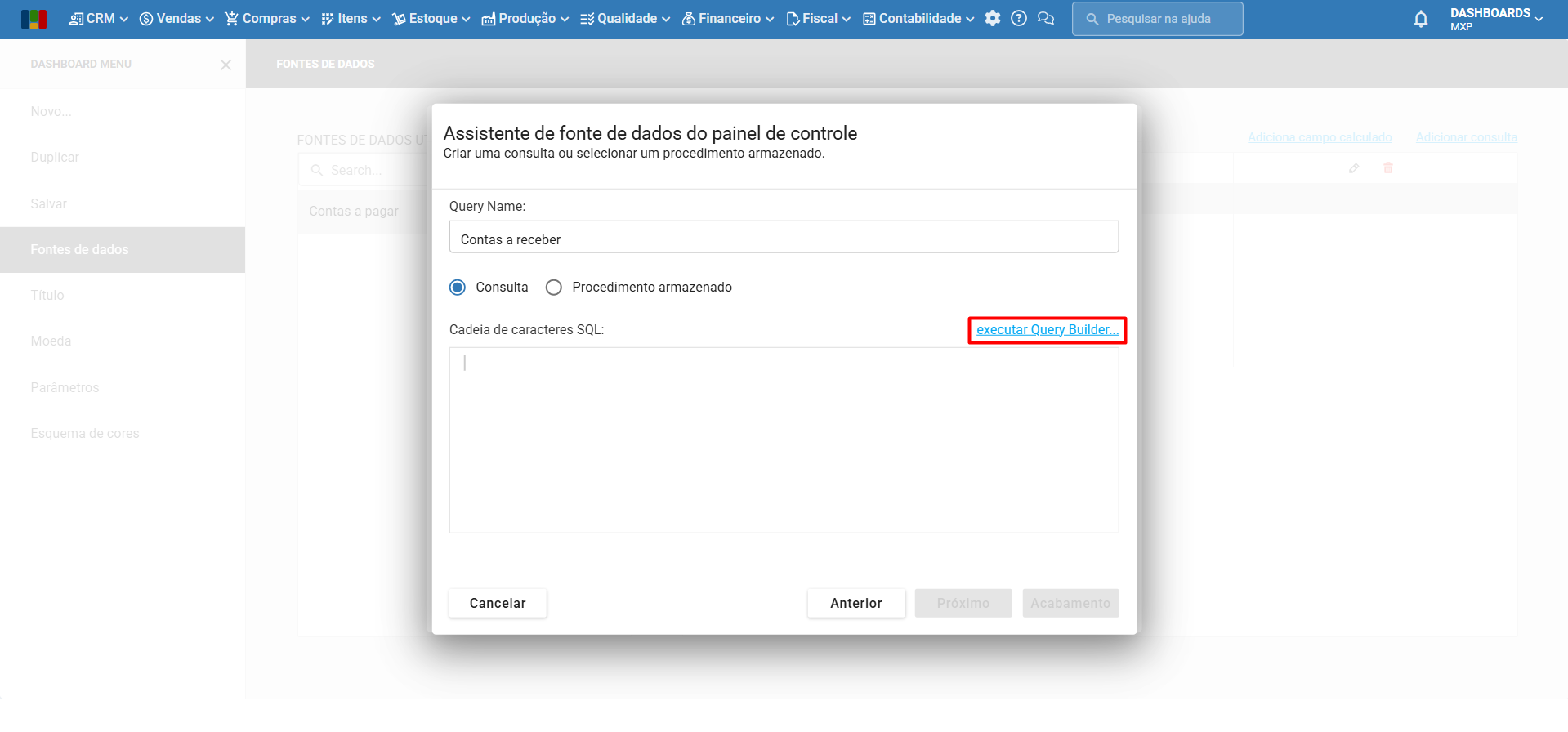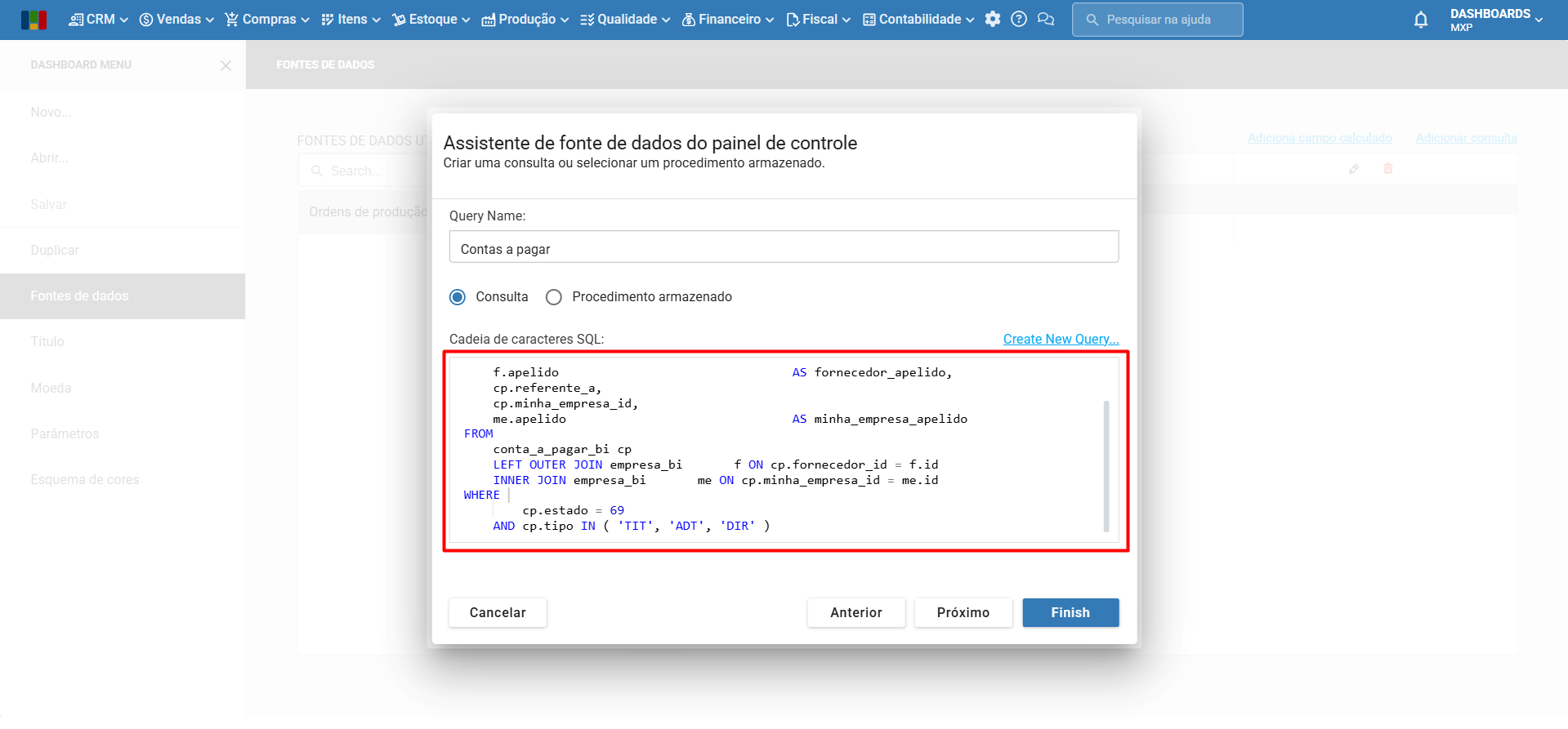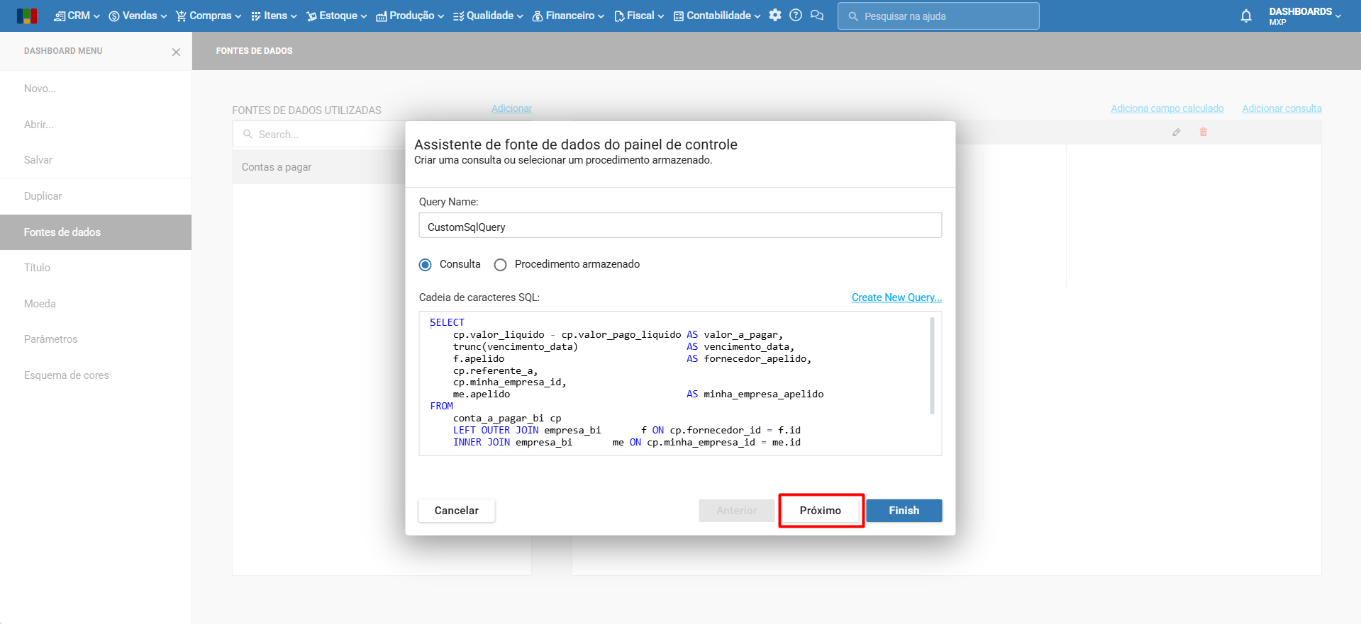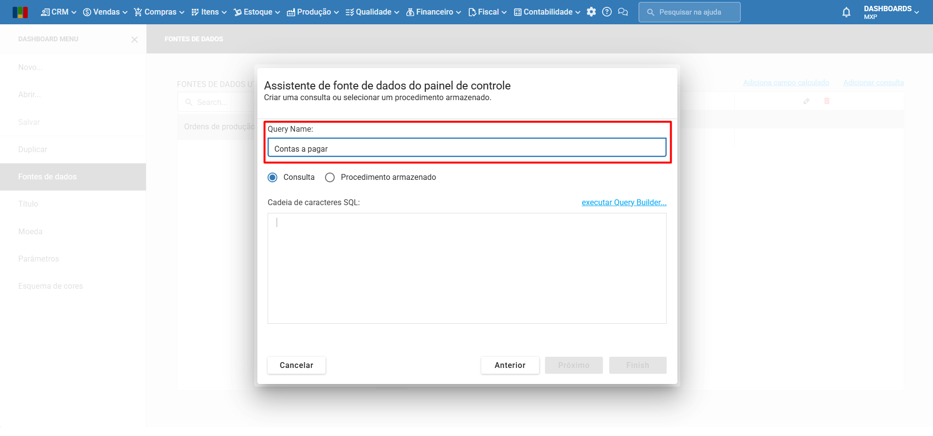 Por acessar diretamente todos os dados armazenados pelo ERP MAXIPROD, é necessário informar uma query (“consulta”). Assim, somente os dados necessários serão incluídos na configuração do dashboard.