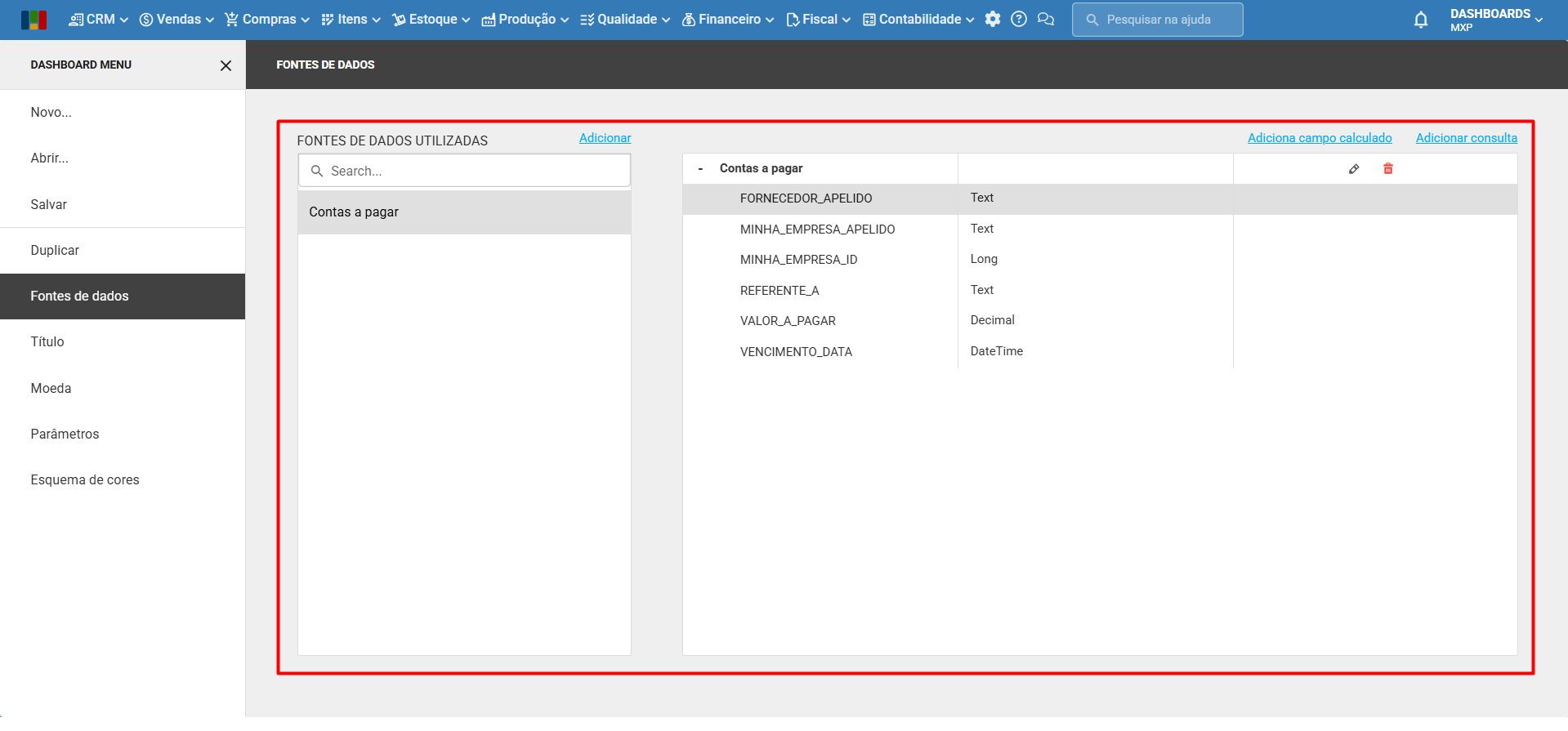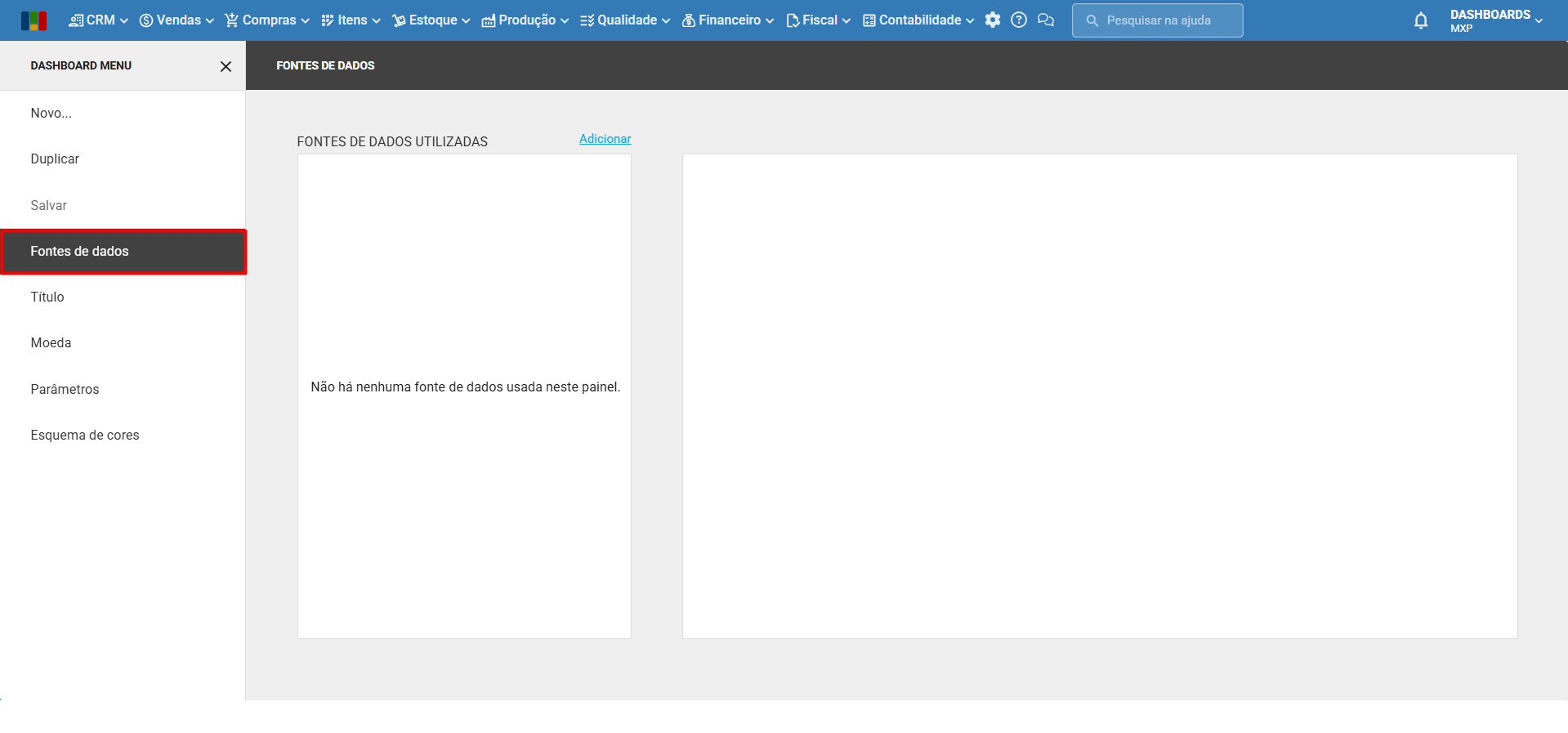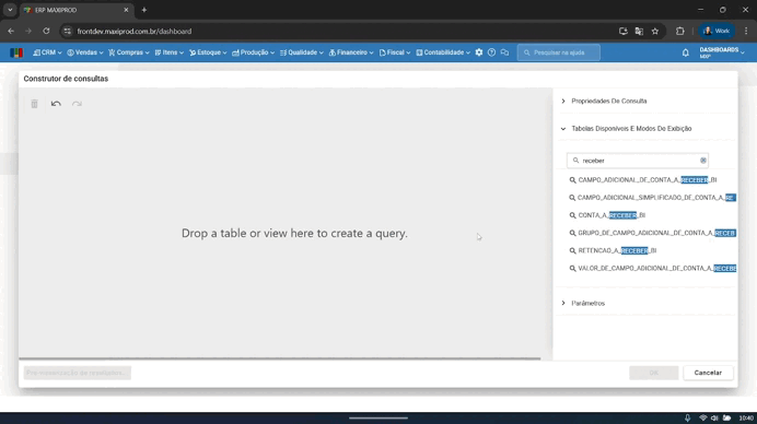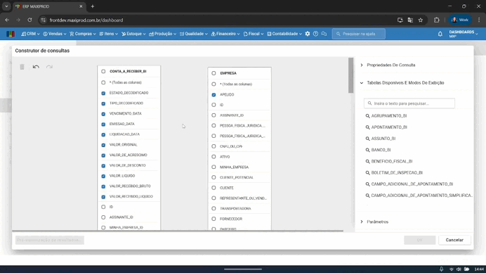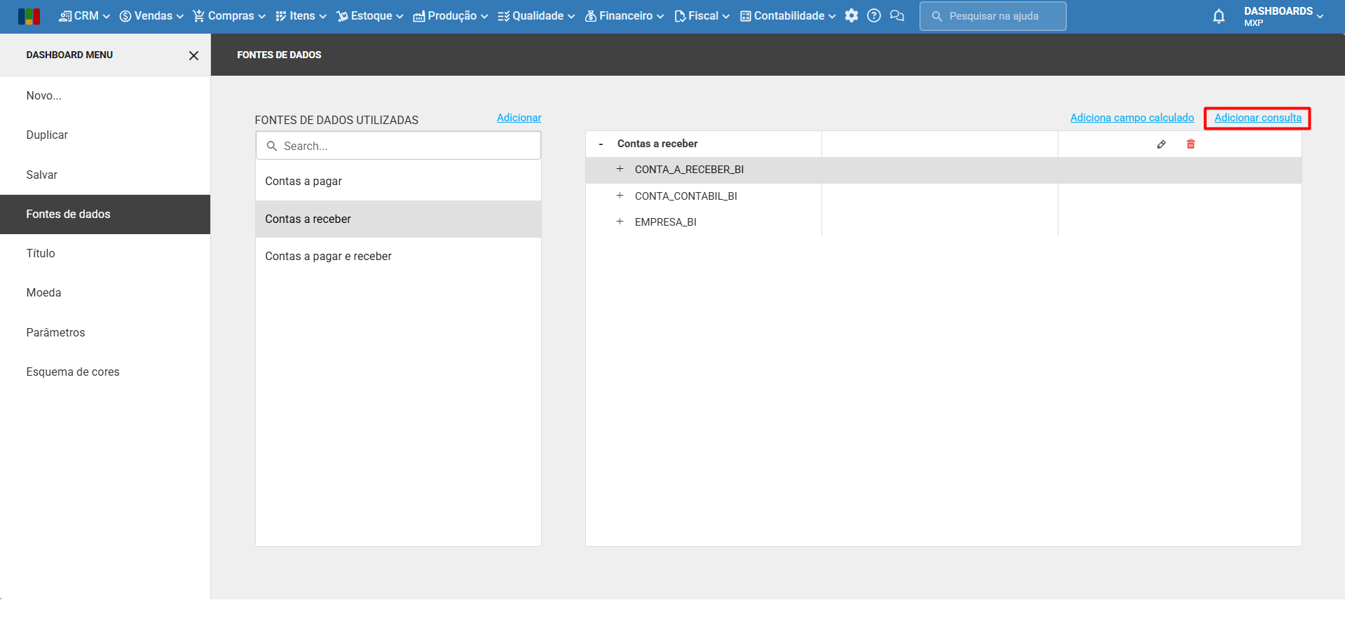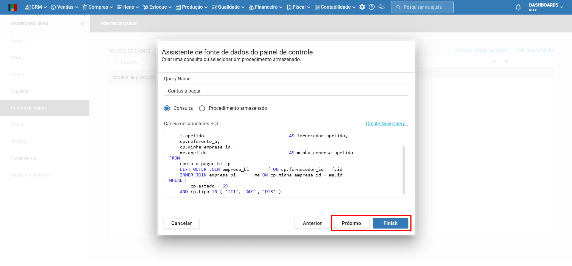 Por acessar diretamente todos os dados armazenados pelo ERP MAXIPROD, é necessário informar uma query (“consulta”). Assim, somente os dados necessários serão incluídos na configuração do dashboard.
