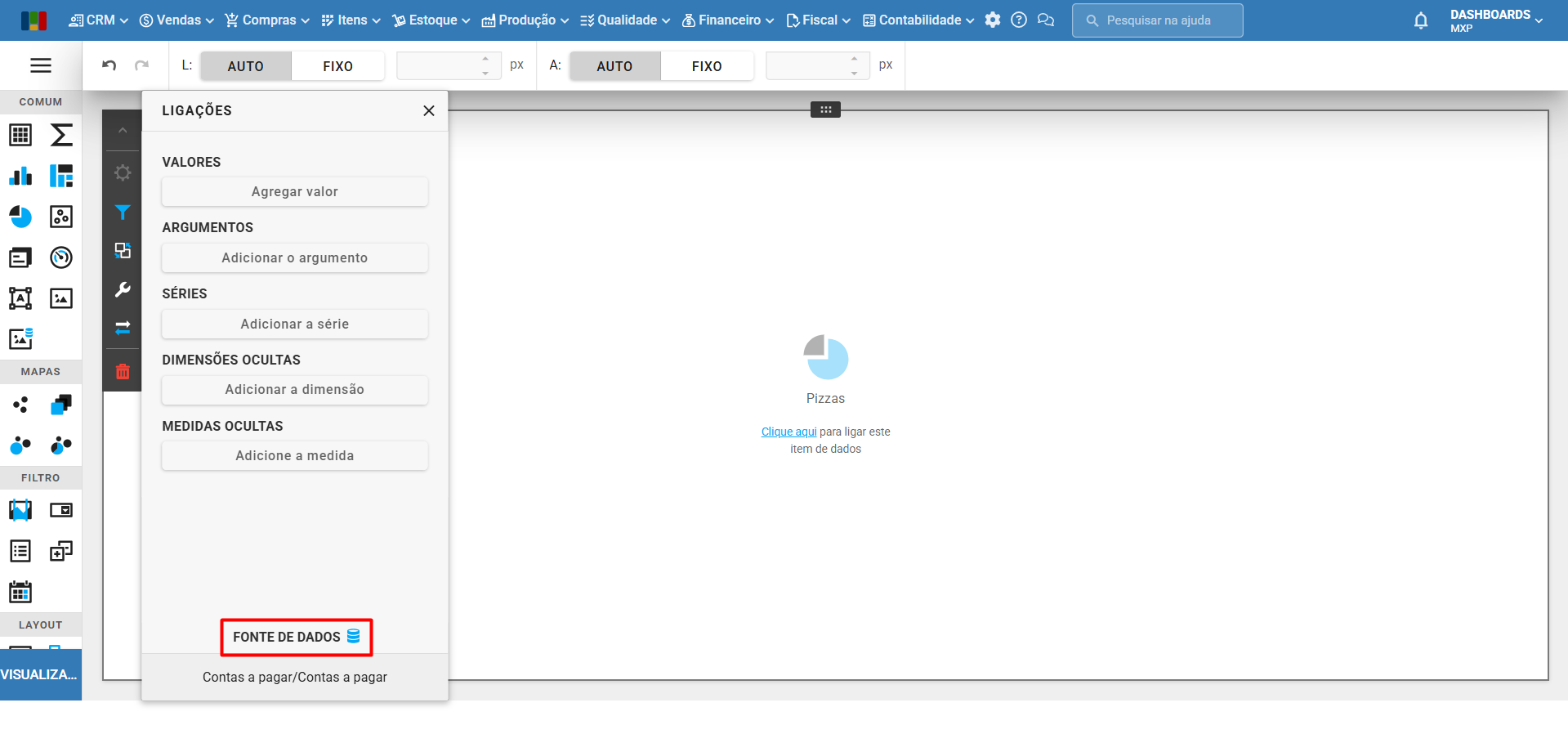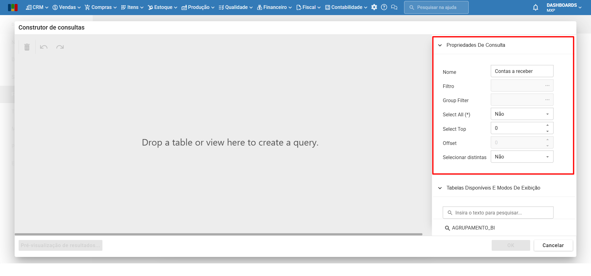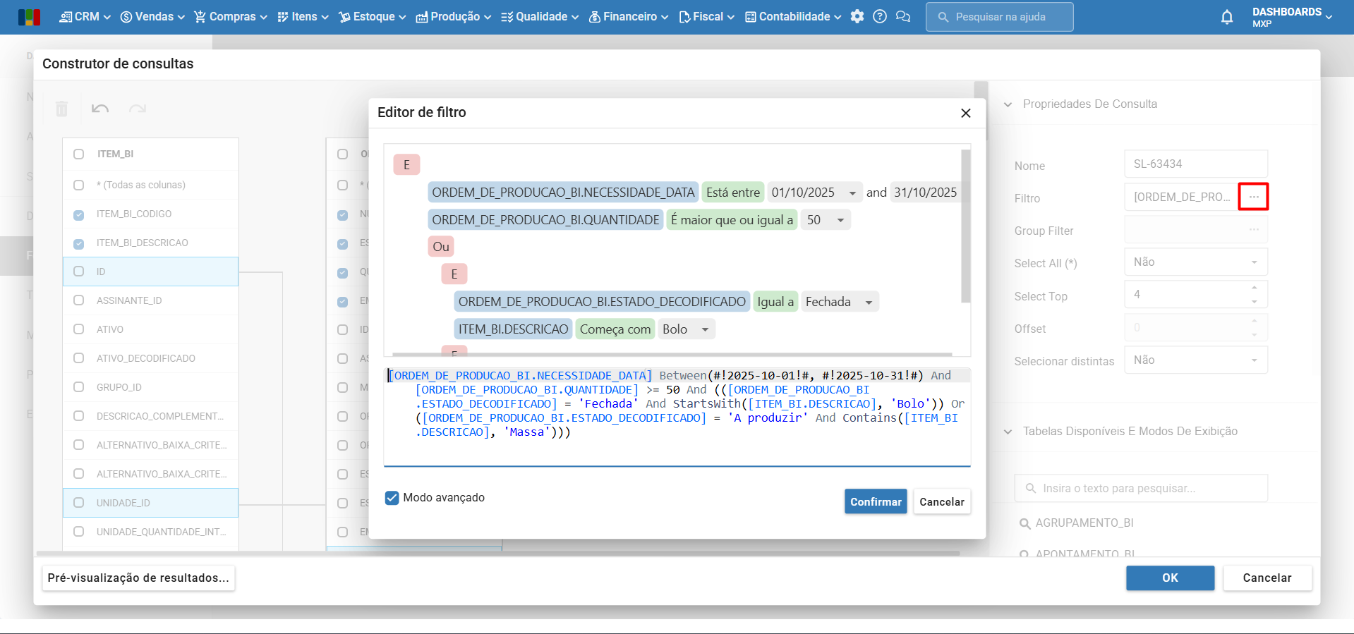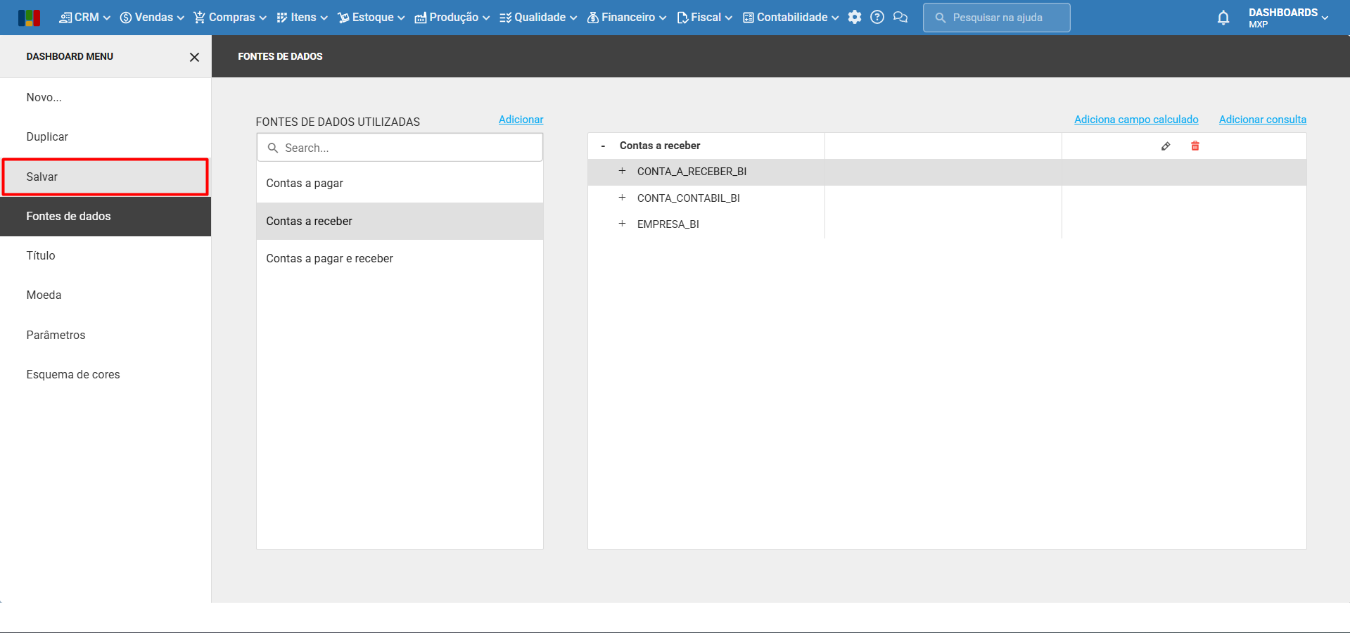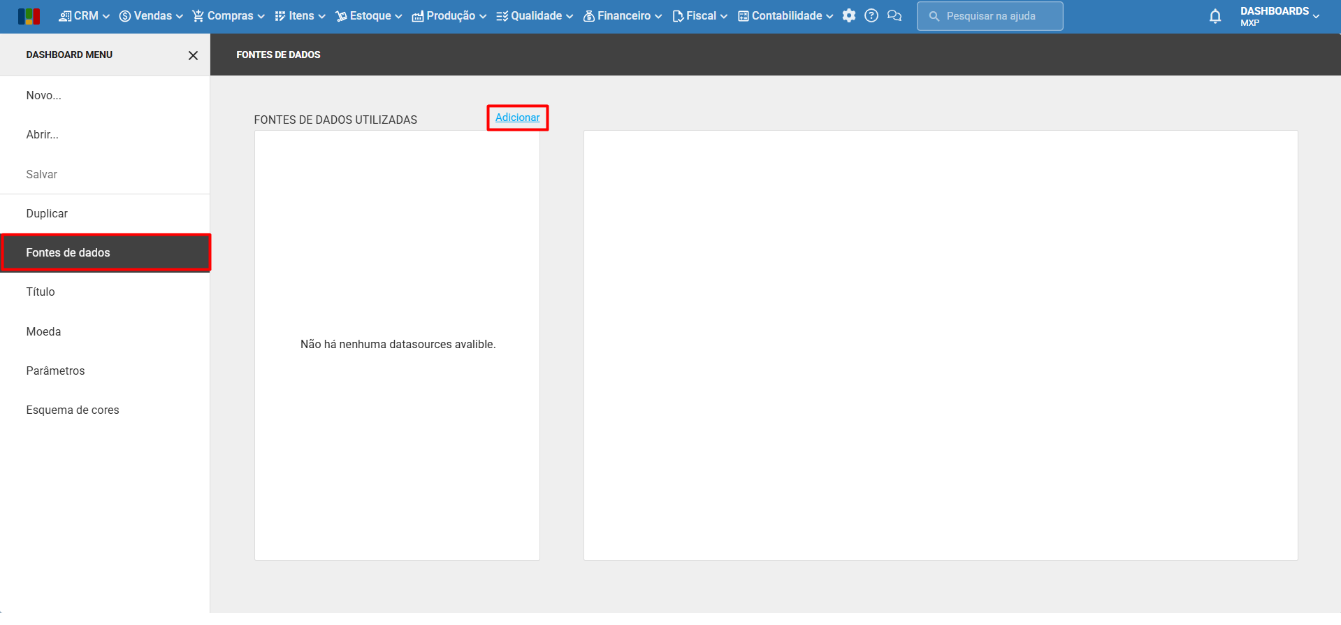 Por acessar diretamente todos os dados armazenados pelo ERP MAXIPROD, é necessário informar uma query (“consulta”). Assim, somente os dados necessários serão incluídos na configuração do dashboard.