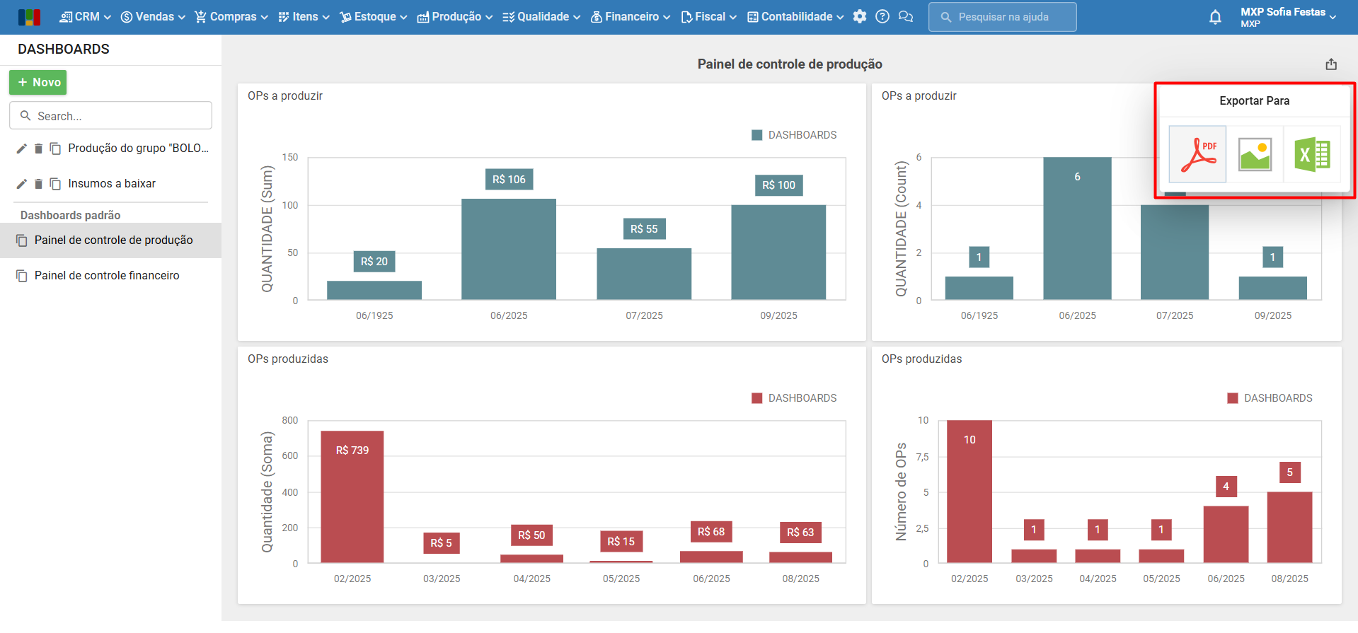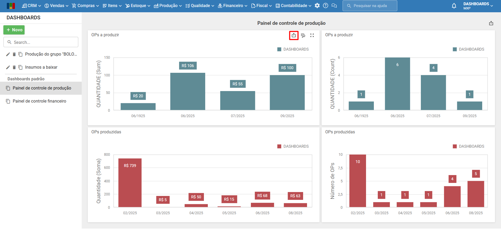 1) Acesse o dashboard que deseja, e clique no ícone de “exportar”.