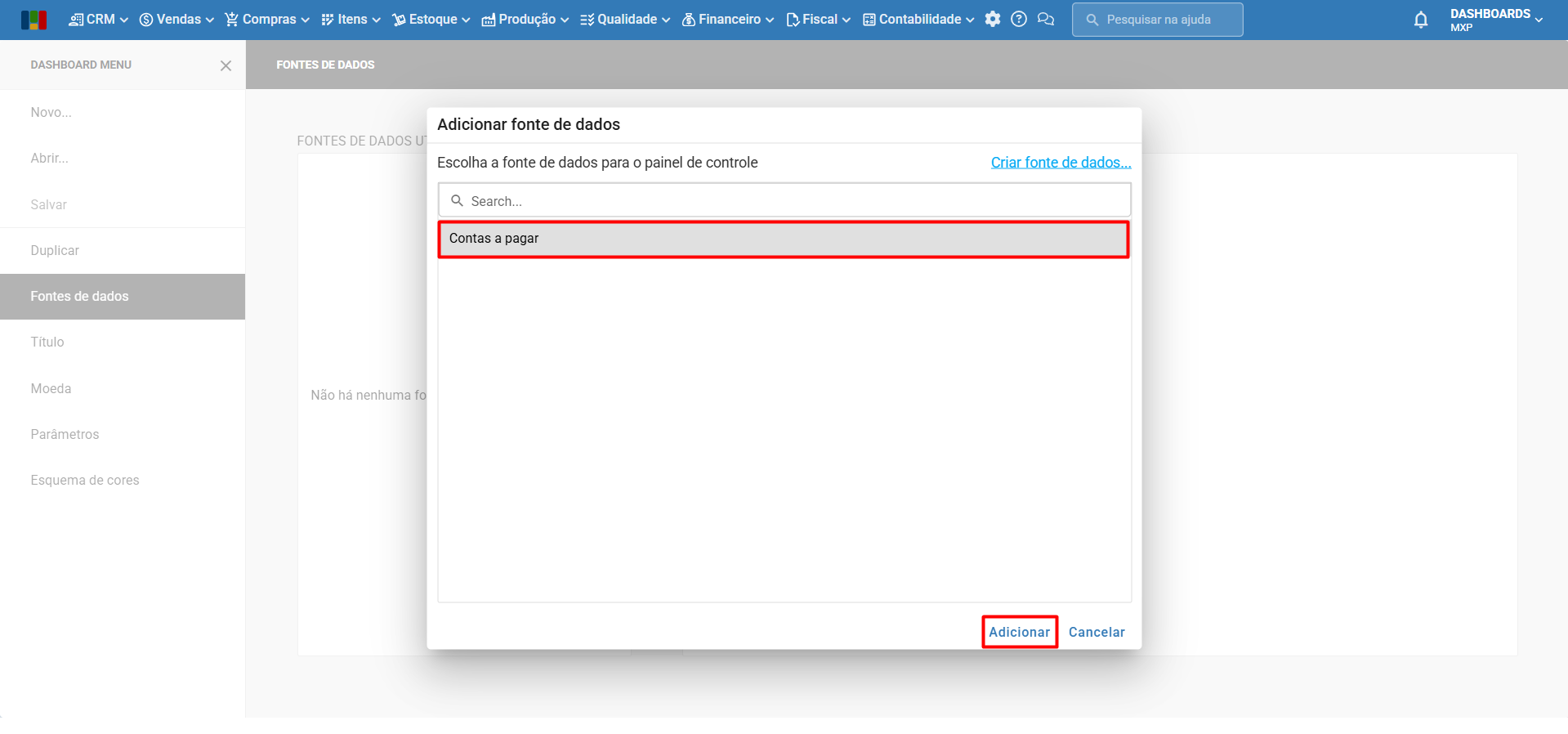 4) Caso opte por “Finish”, selecione a fonte que cadastrou, então clique em “Adicionar”.