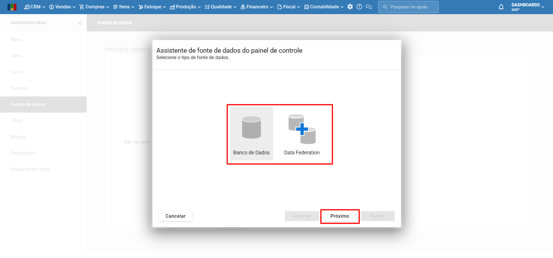 4) Será mostradas as opções de fonte abaixo. Para criar uma nova consulta, selecione a opção “Banco de Dados”. Se deseja mesclar duas consultas já existentes, selecione “Data Federation”. Após isso, clique em “Próximo”.