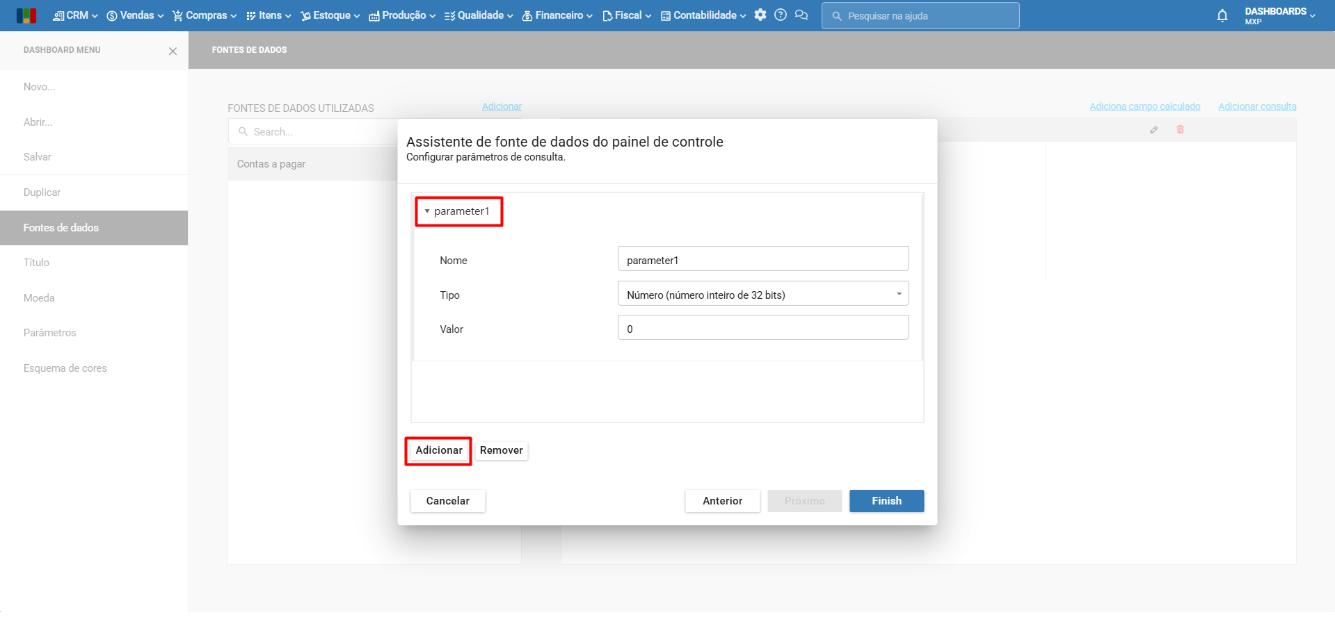 3) Após informar o SQL, clique em “Próximo” para cadastrar um parâmetro, ou em “Finish” para finalizar o cadastro da fonte de dados. Para saber mais sobre parâmetros, clique aqui.