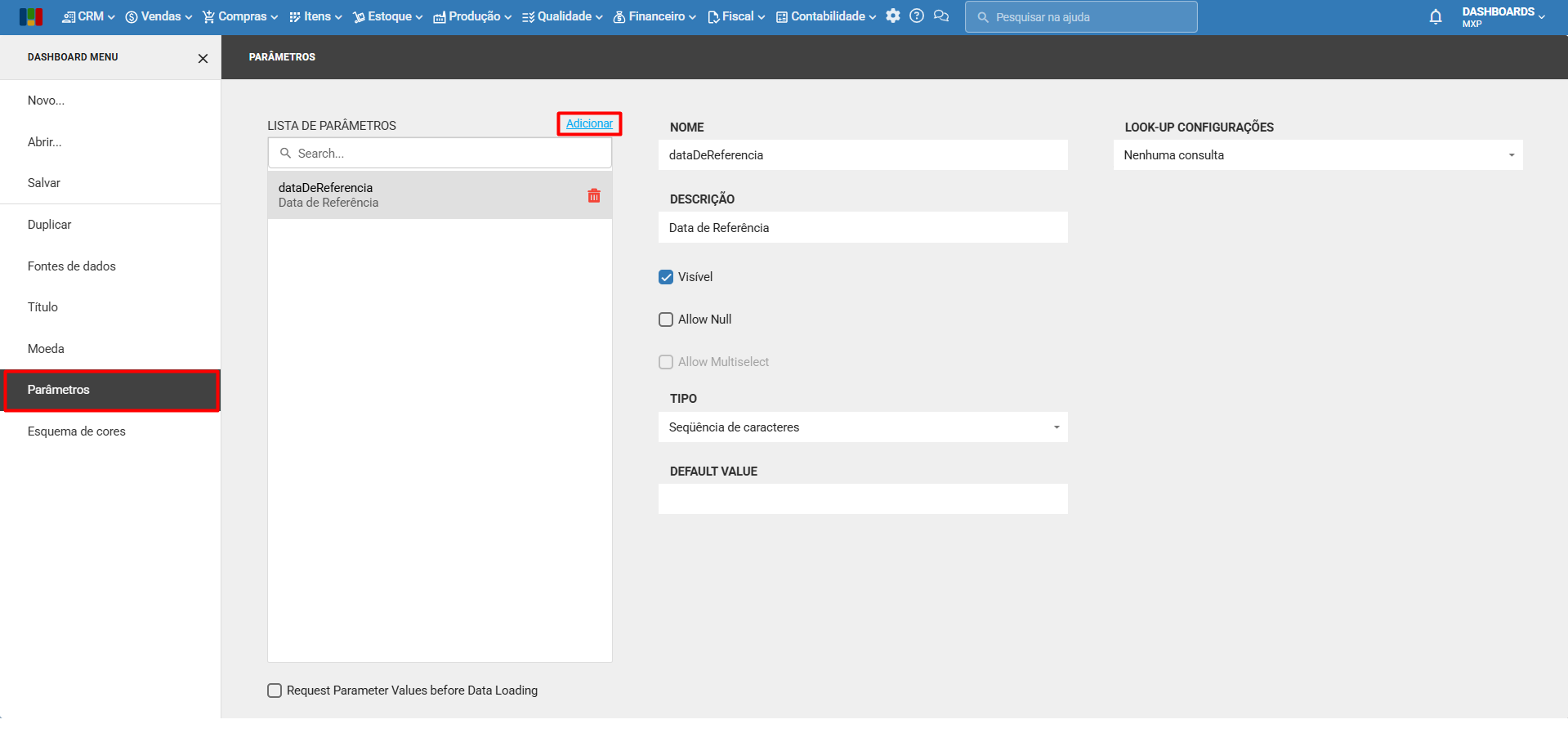 2) Clique em “Adicionar”, depois clique no parâmetro criado, para configurá-lo.