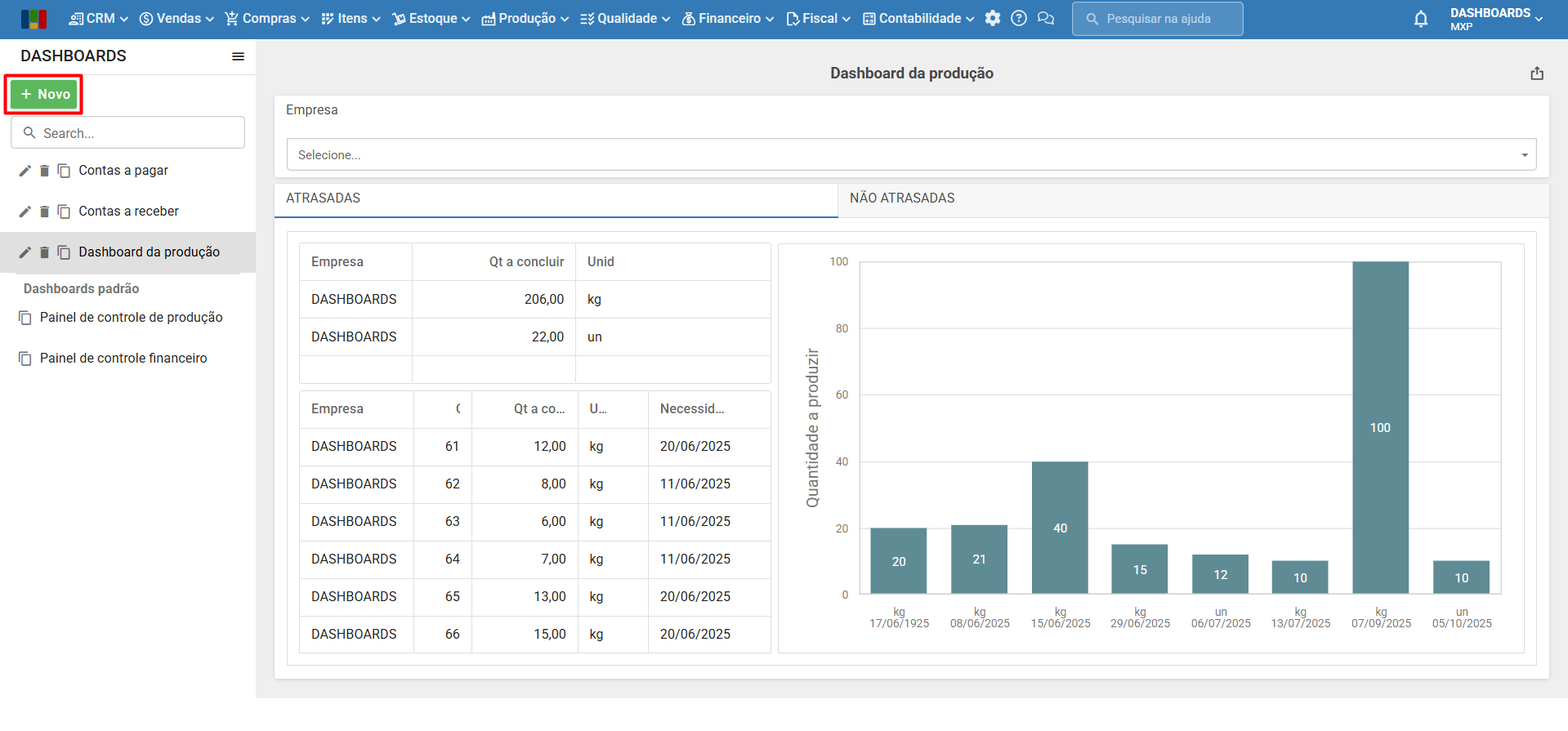 2) Após acessar a tela “Dashboards”, clique no botão verde “Novo”, para cadastrar um dashboard.