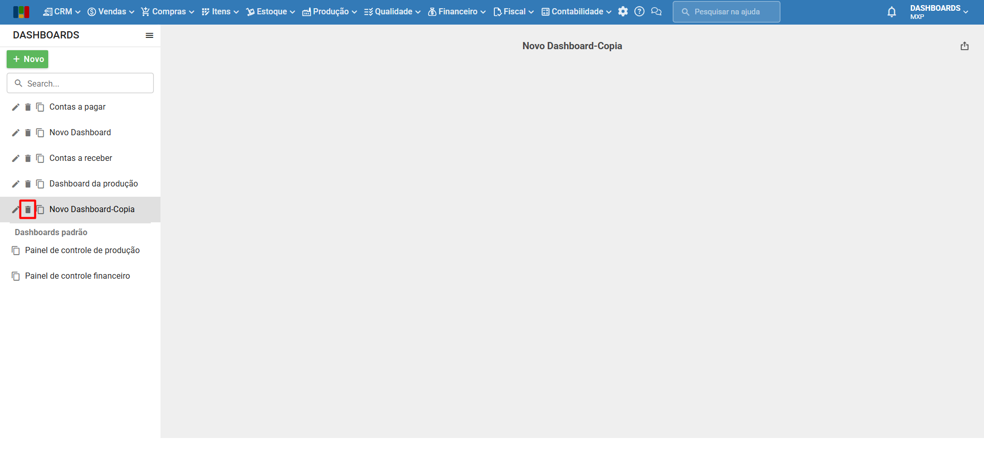 5) Para excluir um dashboard personalizado, clique no ícone de “lixeira”.