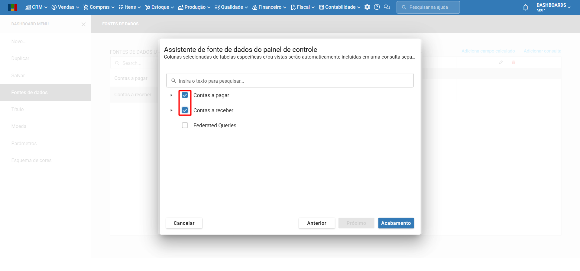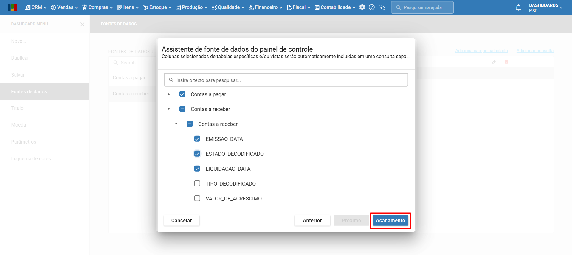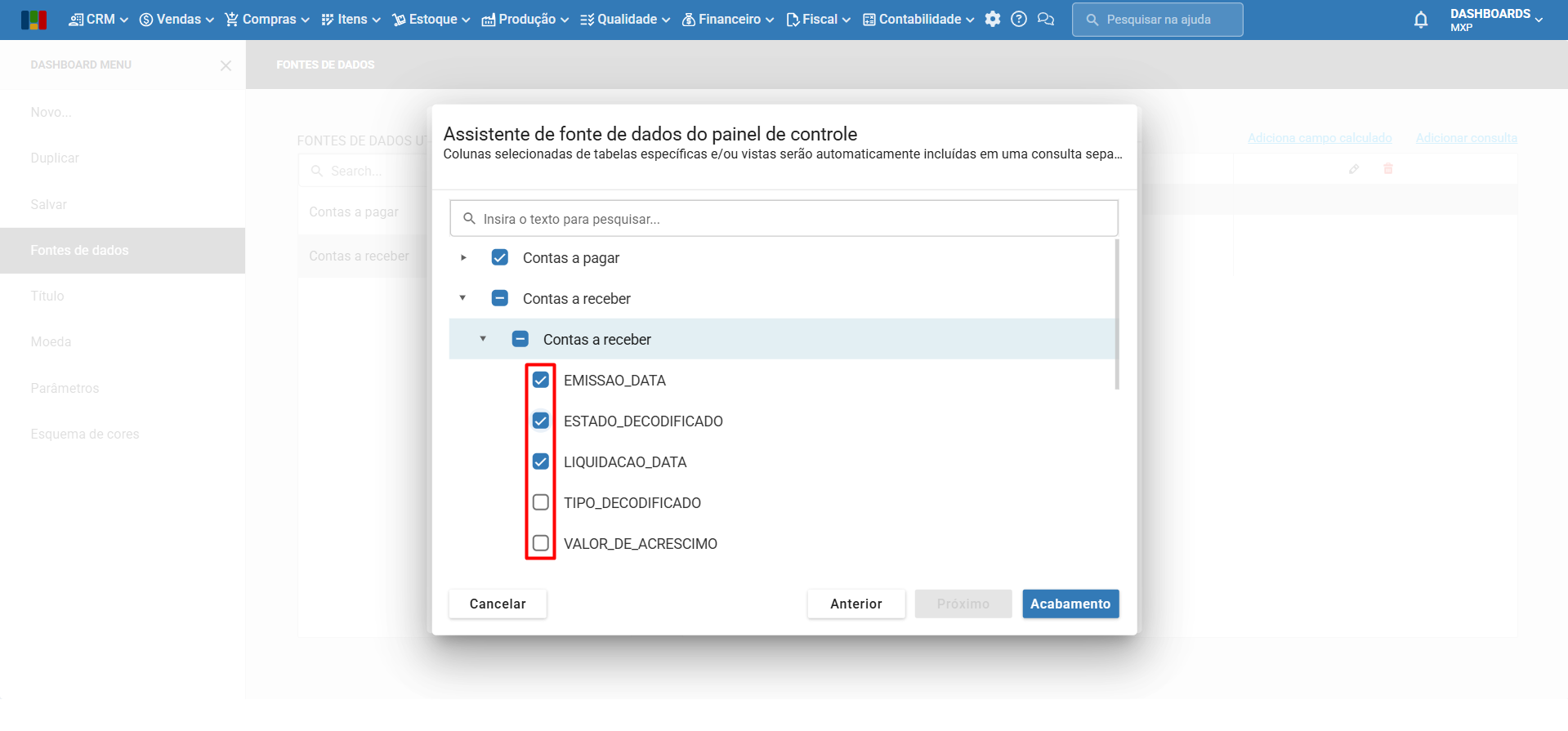 7) Clicando na “caixa de seleção”, selecione as colunas que deseja incluir na fonte de dados.