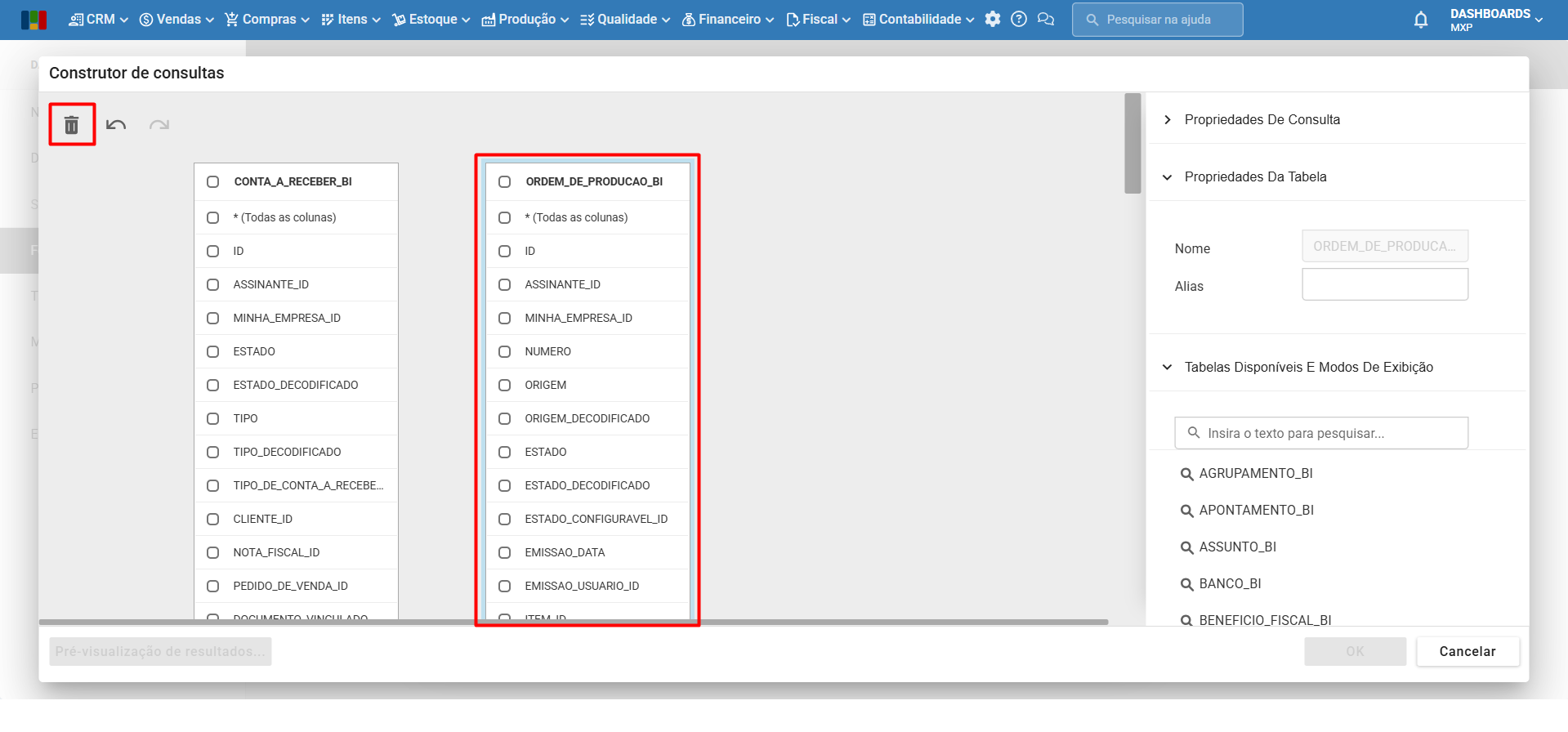 9) Para realizar a conexão entre duas tabelas (equivalente ao “inner join” no SQL), selecione a coluna “id” de uma das tabelas e arreste para a coluna “id” da outra tabela, que corresponda ao mesmo registro (id de pedidos de venda, empresas, etc). Essa junção é necessária para poder finalizar a criação da fonte de dados. No exemplo abaixo, foi conectado “MINHA_EMPRESA_ID”, de contas a receber, com o “ID” de empresas.