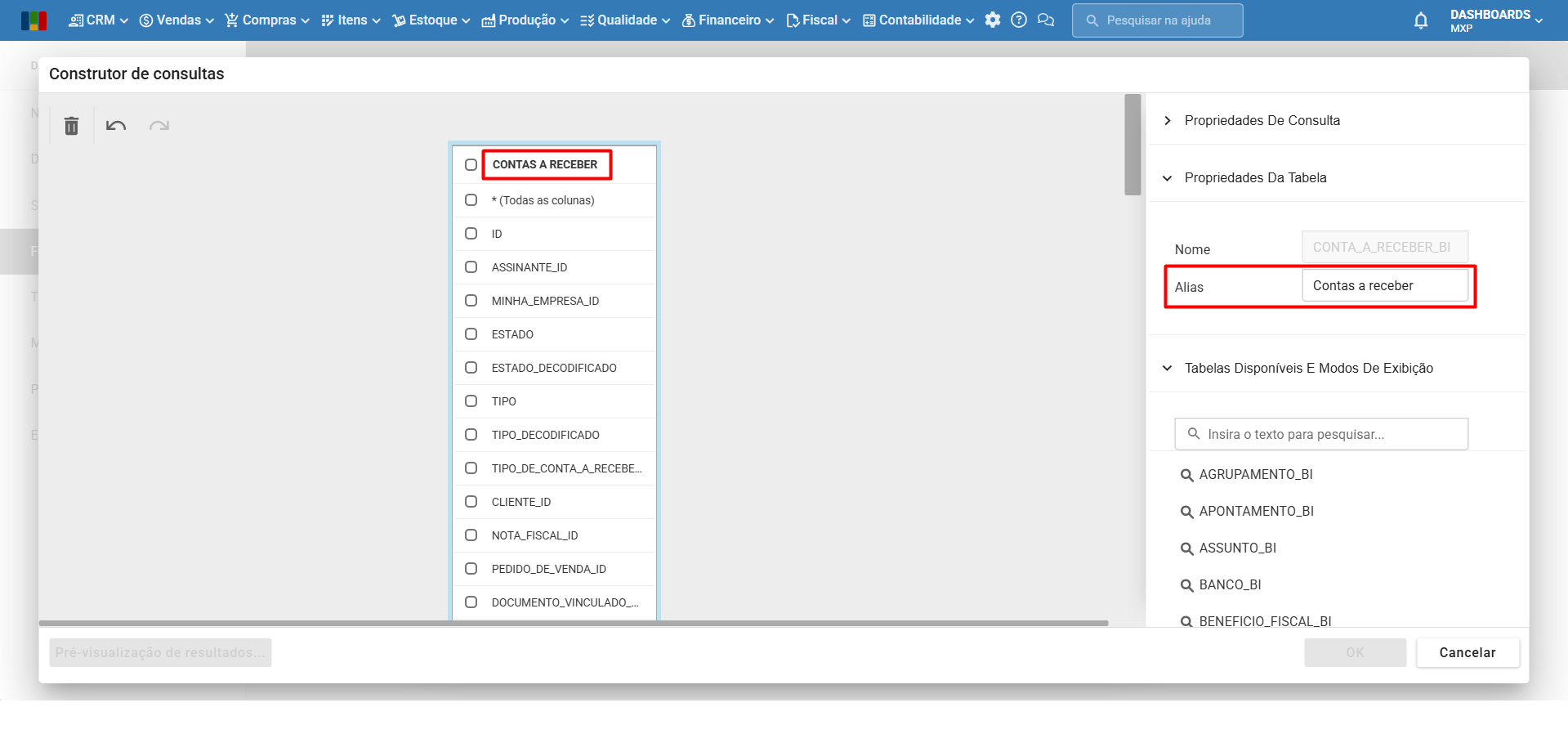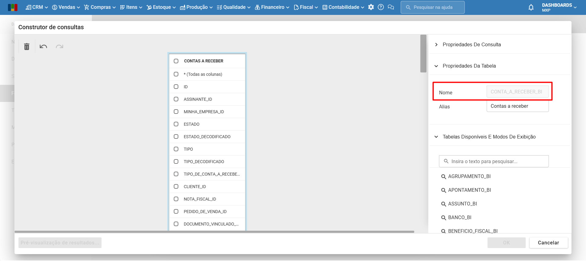 5) Ao selecionar a tabela, a aba “Propriedades Da Tabela” é habilitada. Nela, é possível alterar título da tabela, por meio do campo “Alias”. Se preenchido, este será o nome usado no momento que configurar gráficos, filtros, entre outros.