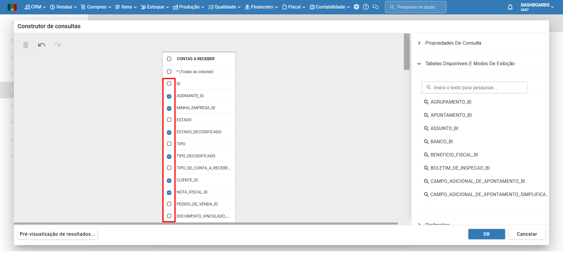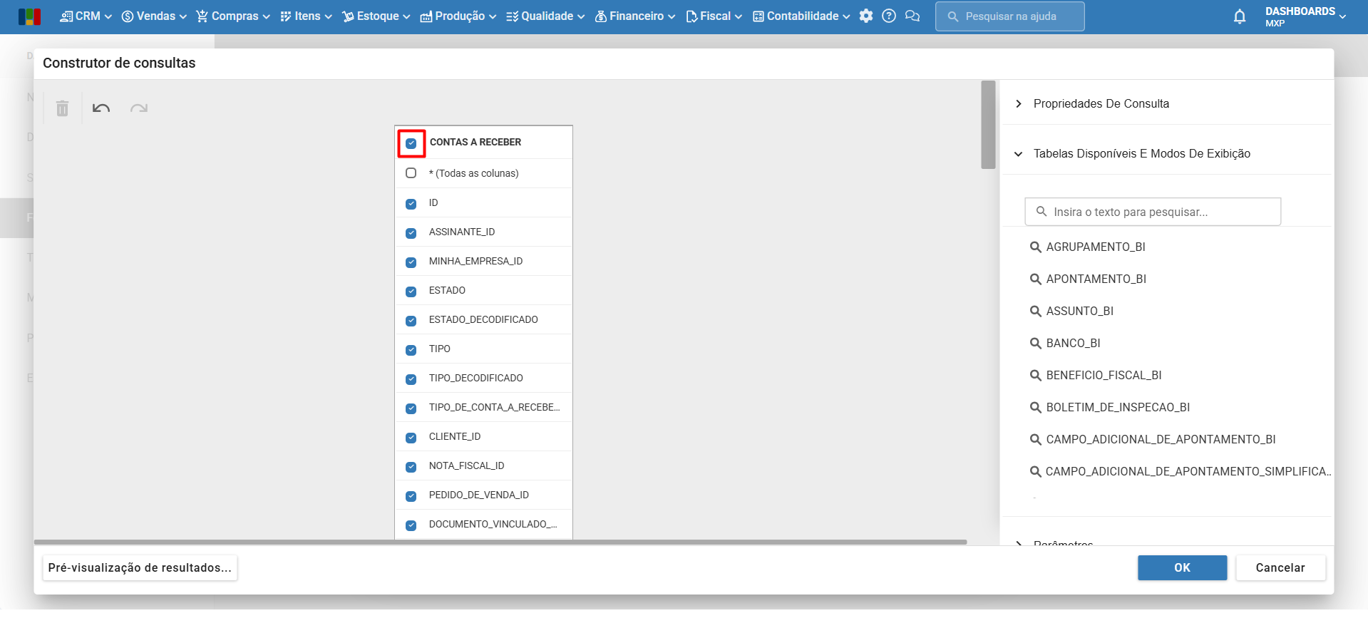 2) Para selecionar apenas colunas específicas, abra as tabelas, e clique na caixa de seleção dessas colunas.