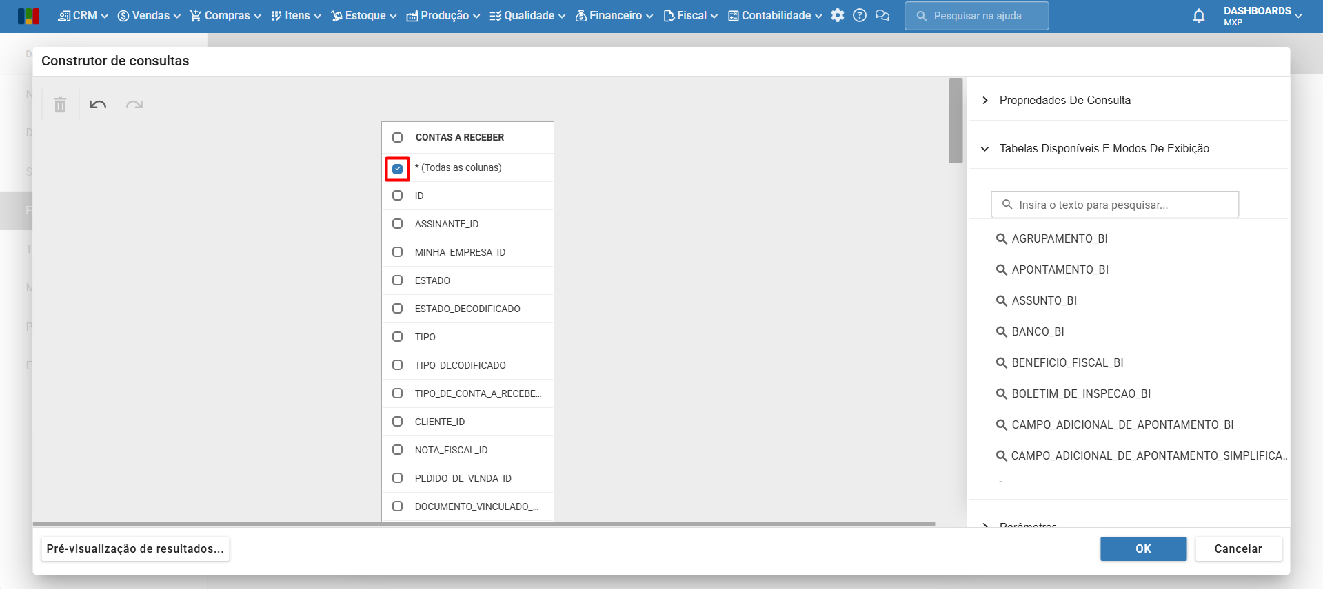 - Select All (*): se marcado como “Sim”, serão incluídos todos os campos, de todas as tabelas incluídas na consulta.