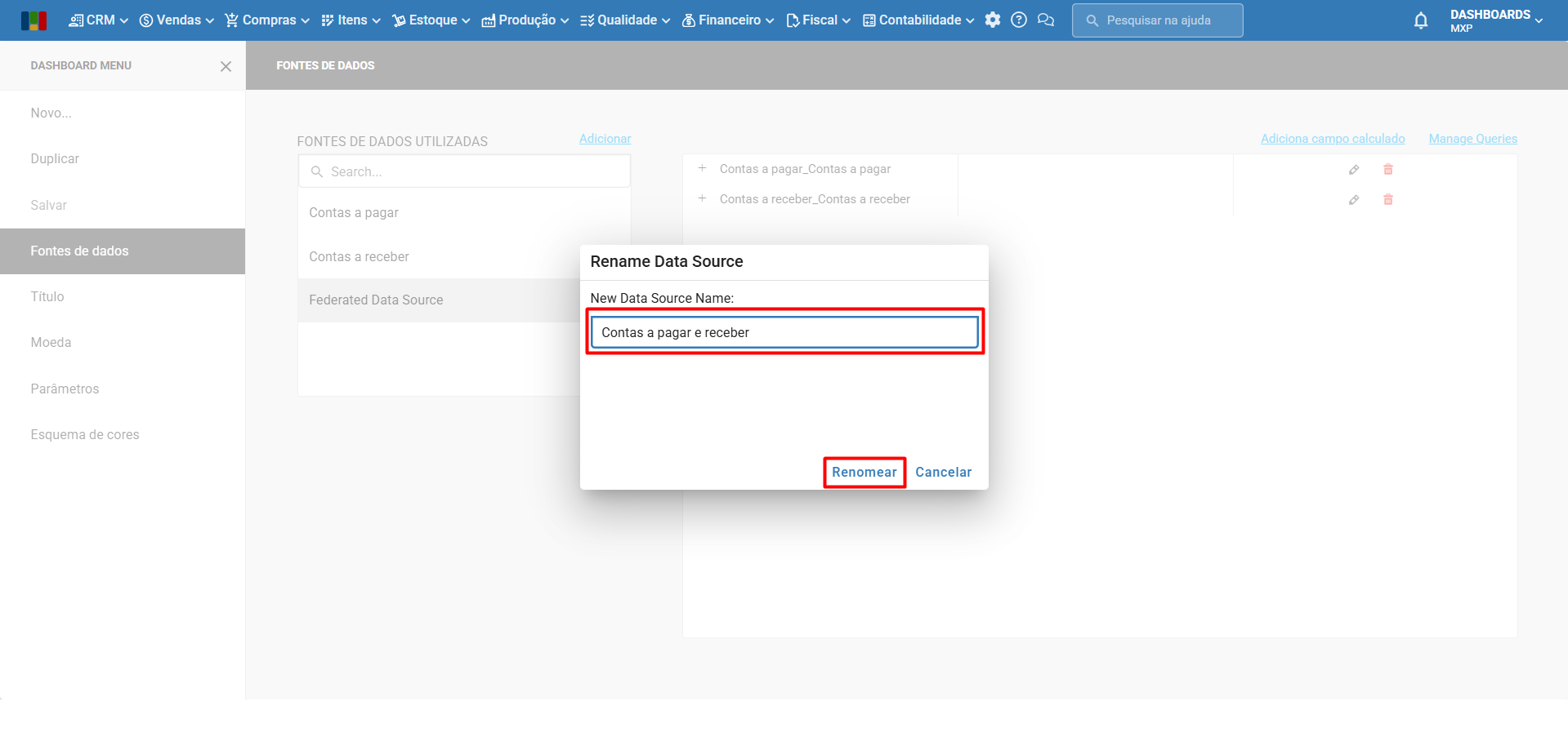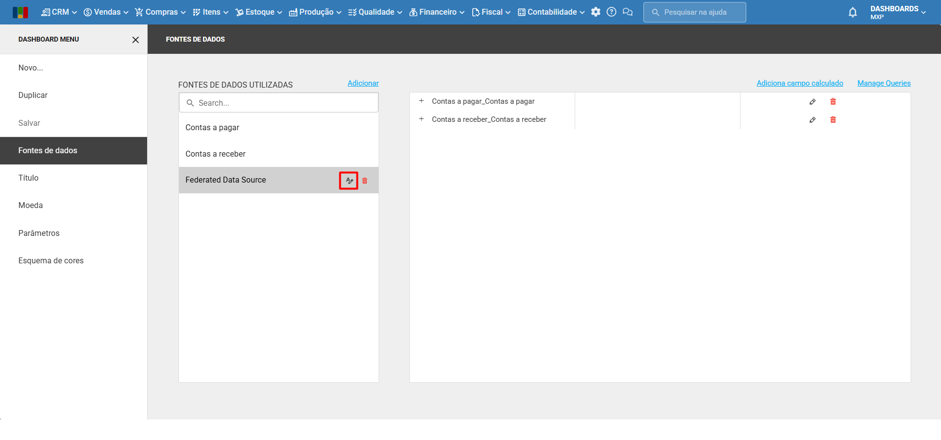 Uma vez cadastrada, é possível editar, excluir e incluir novas consultas a fontes de dados existentes.