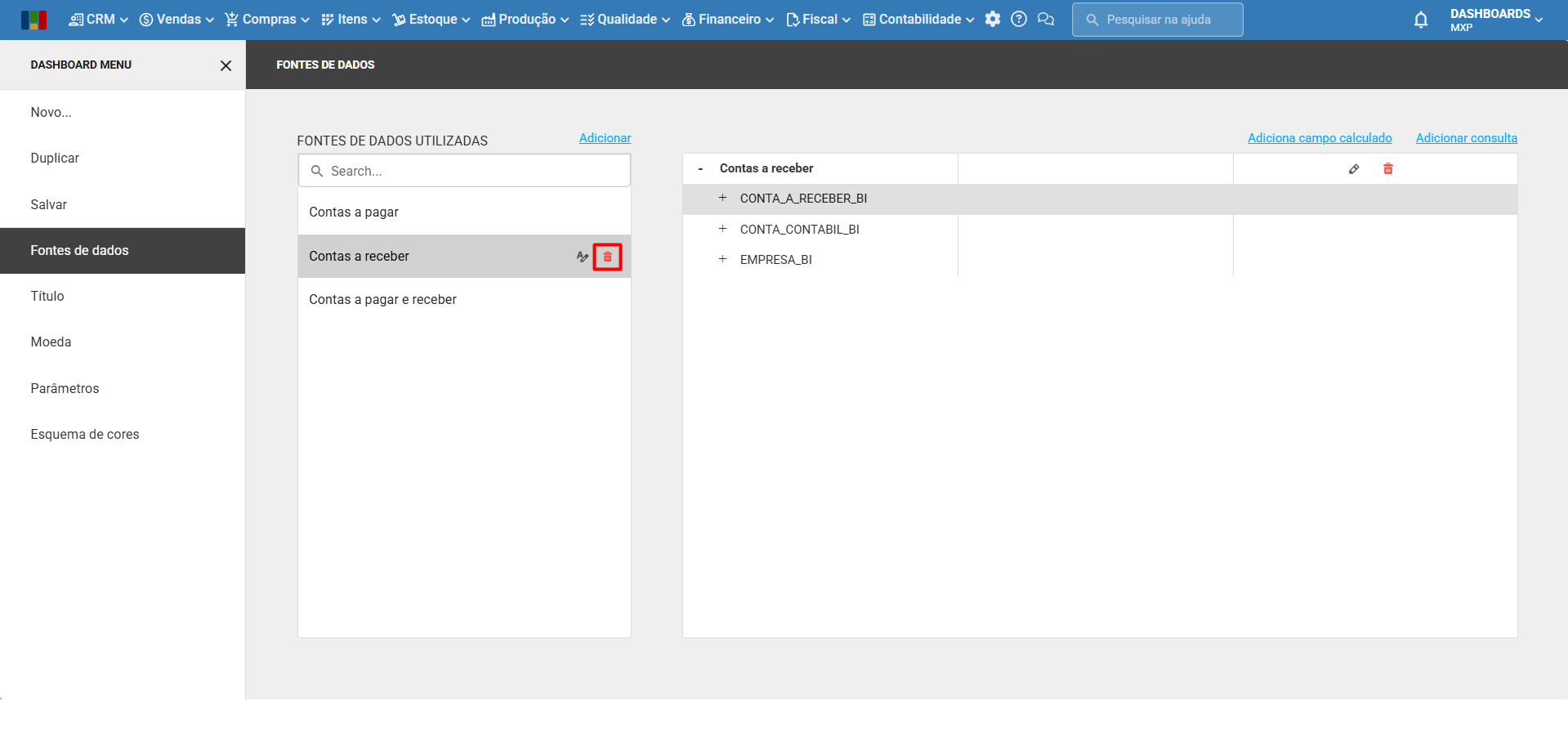 3) Para excluir uma fonte de dados, coloque o mouse em cima de seu cadastro, então clique no ícone de “lixeira”.