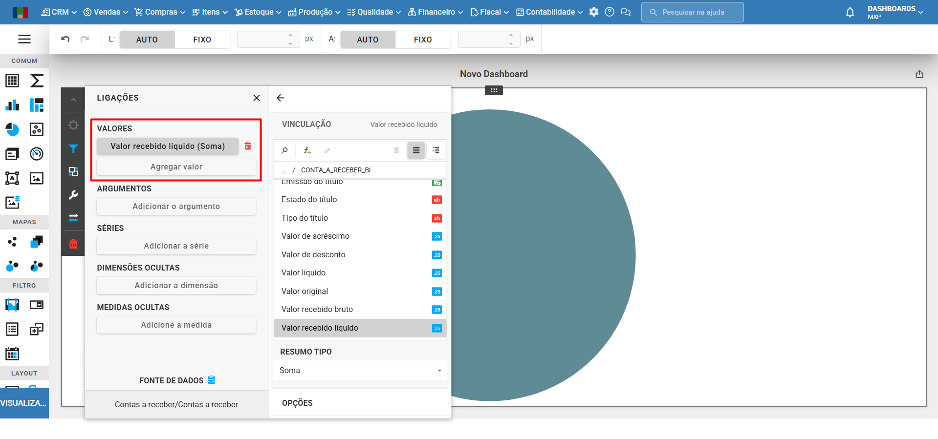 2) Informe em “VALORES” o dado que quer mensurar, como valores líquidos de títulos, quantidade em ordens de produção, etc. Para isso, clique em “Agregar valor”.