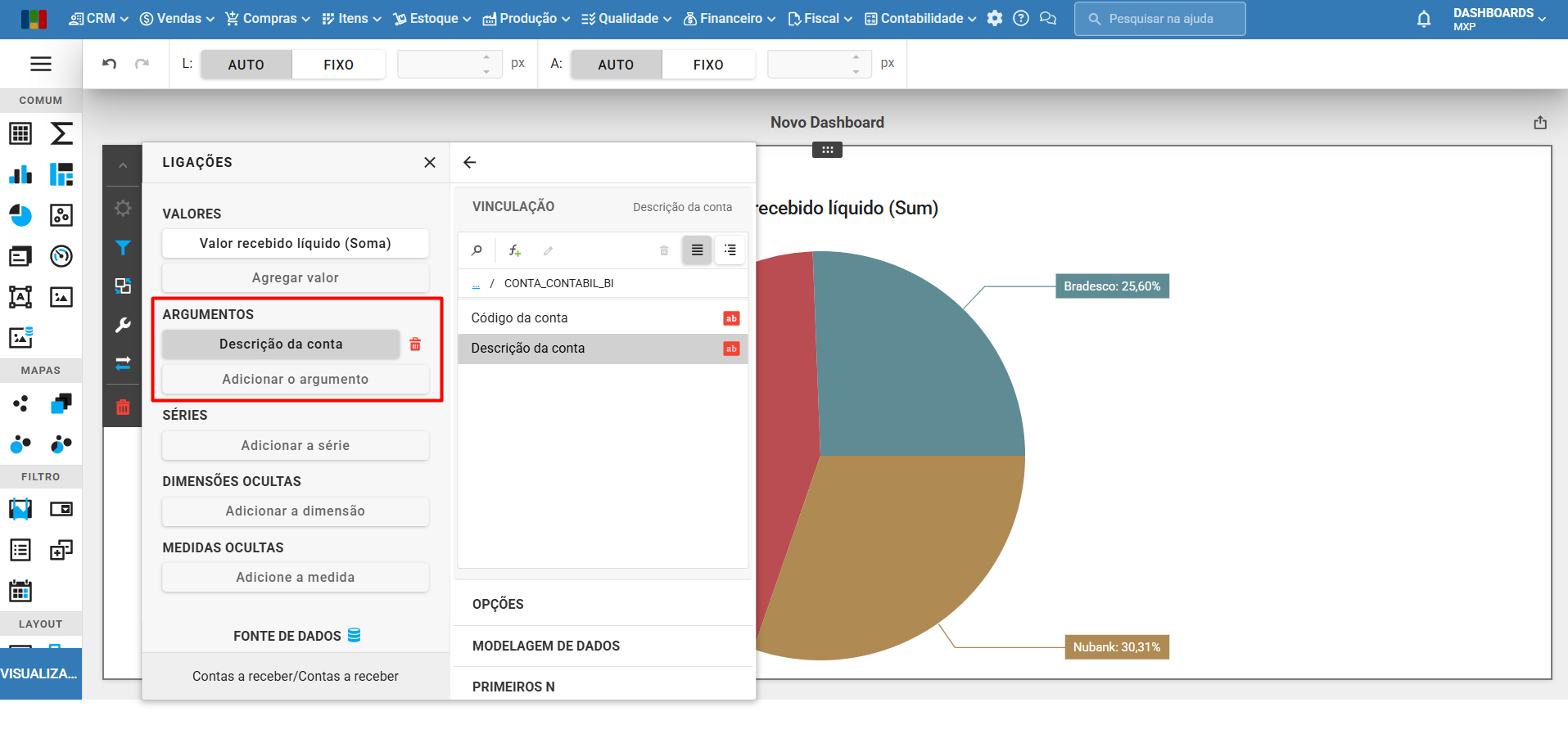 3) Clique em “Adicionar argumentos”, presente em “ARGUMENTOS”, para informar os dados que irão definir como os valores serão agrupados. Um exemplo seria usar a descrição de contas contábeis para agrupar o valor líquido recebido.