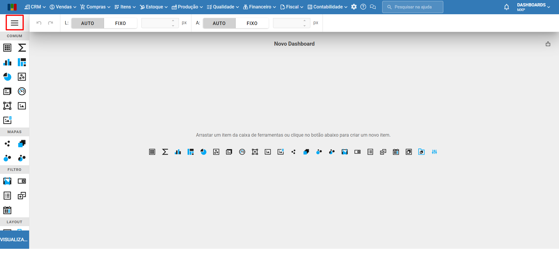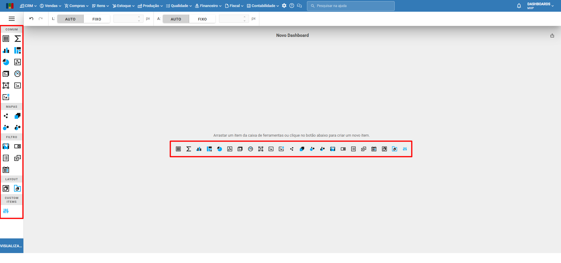 1) Para acrescentar componentes ao dashboard, clique nos ícones presentes no menu lateral e no centro do dashboard.
