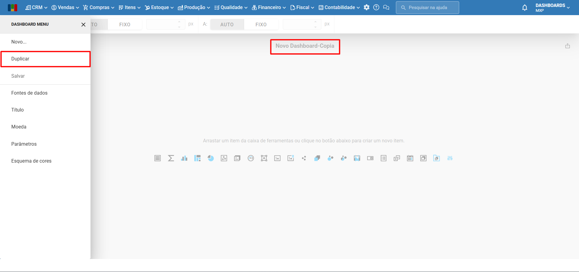 5) Na opção “Duplicar”, o dashboard atual é duplicado. O novo terá as configurações salvas do antigo dashboard, e seu título terá a adição “-Copia”.